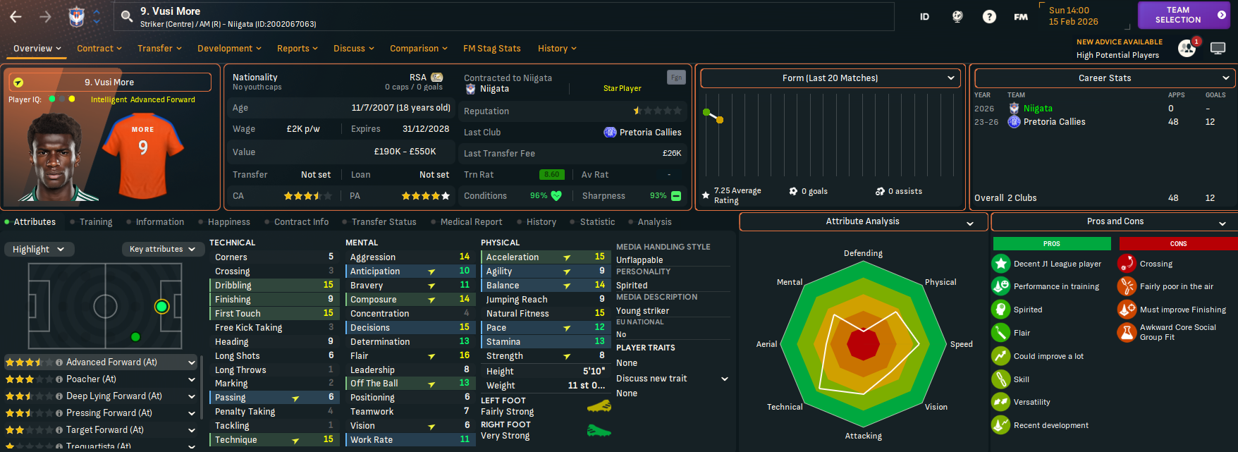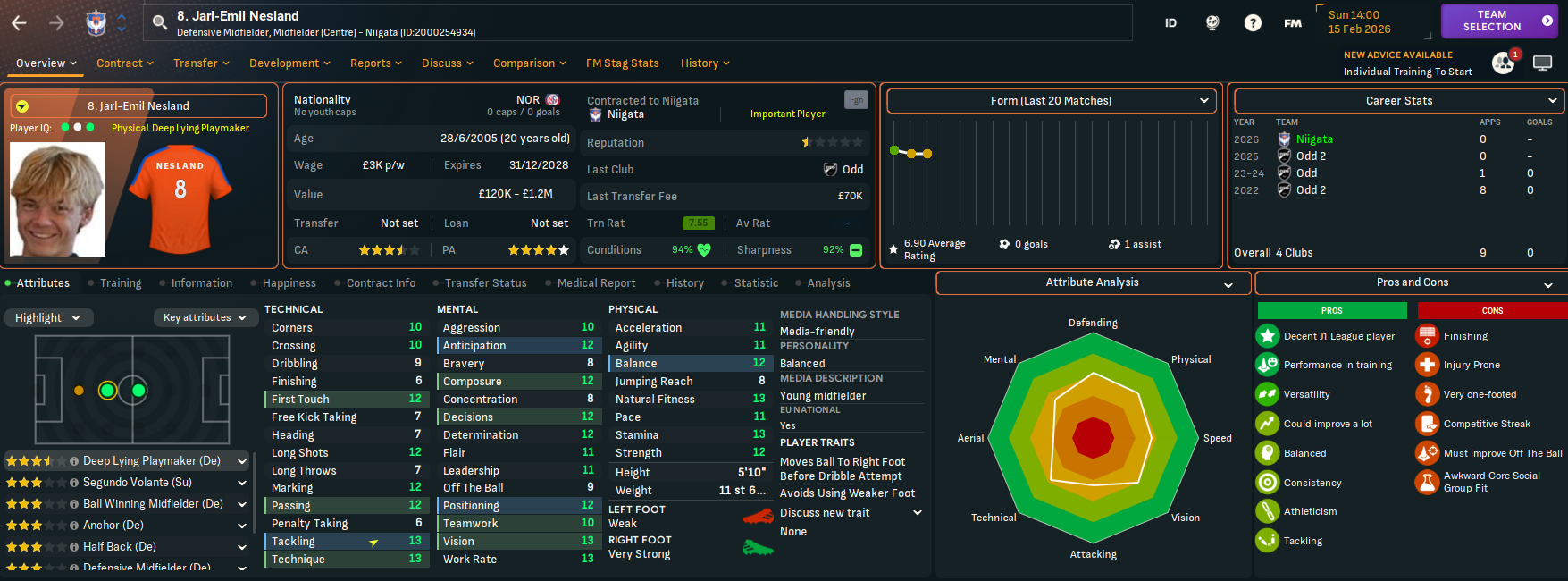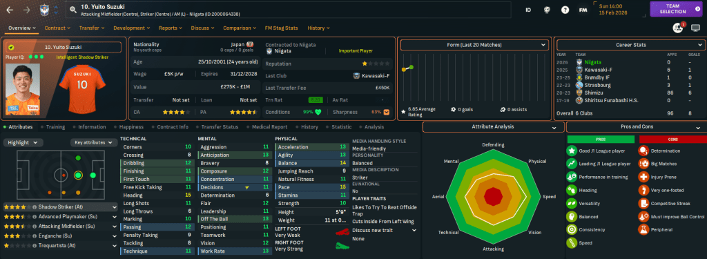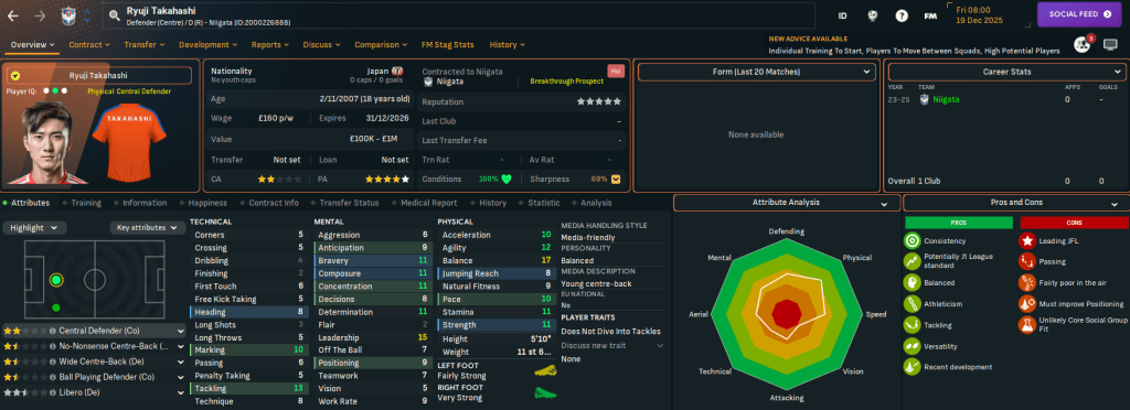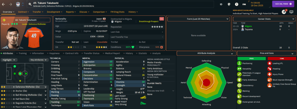 Niigata has two J2 League titles in 2003 and 2022 and, in this save, is currently in J2 League after relegation from J1 League in 2024. It finished below Rasamu’s Sanuki last season but represents a huge step up in stature. Indeed, Rasamu left a club struggling financially to one with £17.3m in the bank, a £15m transfer budget and a £126k weekly wage budget, which is over £100k more than at Sanuki.