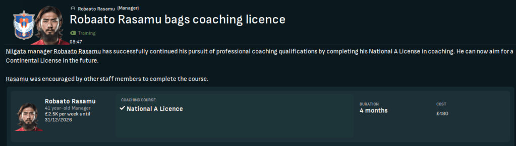 As part of the interview process, Rasamu had asked the Niigata board to send him on a new coaching course. They obliged and he bagged his third badge, the National A Licence, in mid-April.