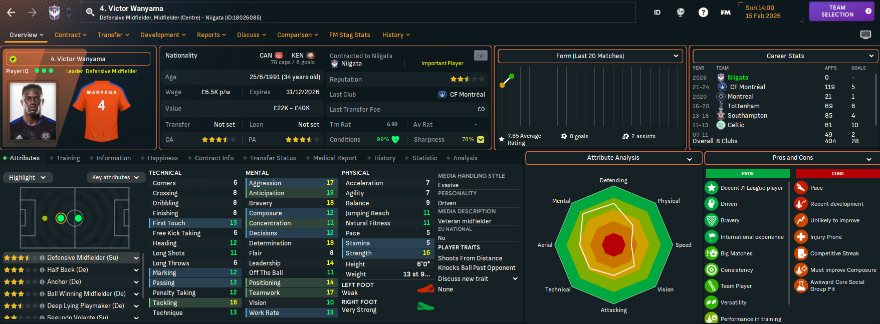Niigata’s first signing was also Rasamu’s first proper cash signing of his career as Yuito Suzuki joined for £300k from Kawasaki. He further strengthened the midfield with a recognisable name as Victor Wanyama joined on a free transfer to bring a bit of experience then promising Norwegian Jarl-Emil Nesland for £70k from Odd. They were joined by promising striker Vusi More for £26k from Pretoria Callies and left-back Junpei Mizuguchi on loan from Kawasaki.