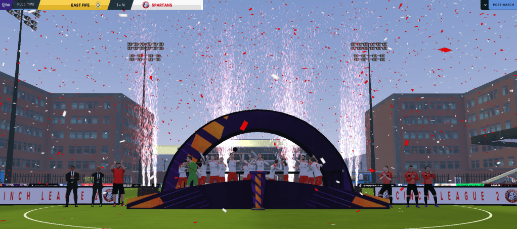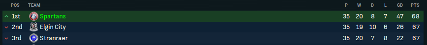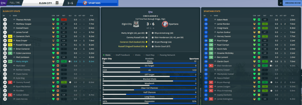 That huge win gave the Spartan Army confidence as they thrashed Bonnyrigg Rose 4-0, leaving them just 3 points off the top with 10 games remaining. They nicked a 2-2 at home to East Fife before Court scored for the first time since his record-breaking brace in a 2-0 win at bottom side Stenhousemuir. A few draws followed, including a 1-1 with 4th-place Forfar to wrap up a playoff place with 5 games remaining and 3 years ahead of the board’s schedule. But they were 7 points behind Stranraer, so automatic promotion was probably a little out of reach. However, another absolute thriller at Elgin saw Spartans score four in the first half and come home 6-3 winners led by a Henderson hat trick.