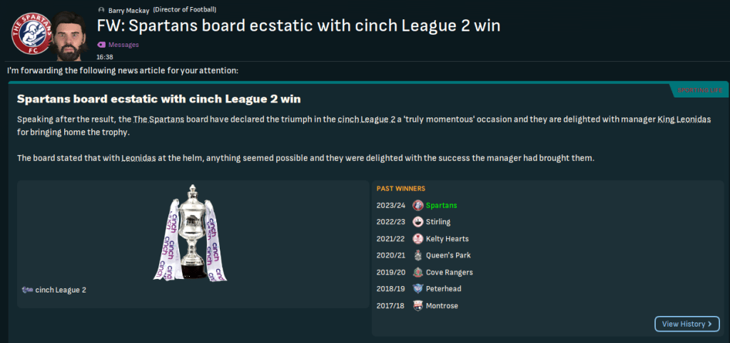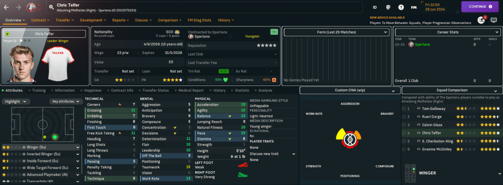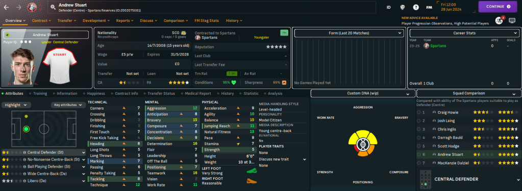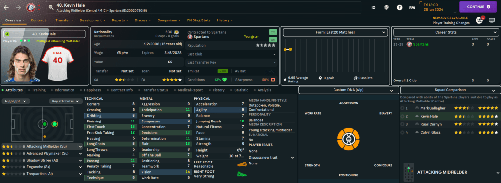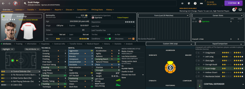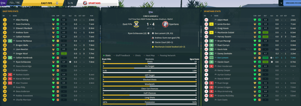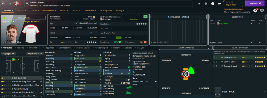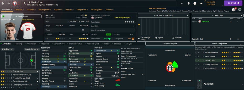 That left Leonidas’ The Spartans FC with one recognised striker, another who wasn’t good enough, and two 16-year-old prospects with a combined 2 appearances for the under-18s. Leonidas particularly liked the look of Ciarán Court, who had 16 determination, 11 stamina and 10 determination with plenty of room for improvement. He wasn’t the only youngster stepping up to the first team though, as he was joined by fellow striker Tom Galloway, centre-back MacKenzie Dalziel and right-back Jamie Riordan, who’s wanted by the likes of Dundee, Inverness and Livingston.