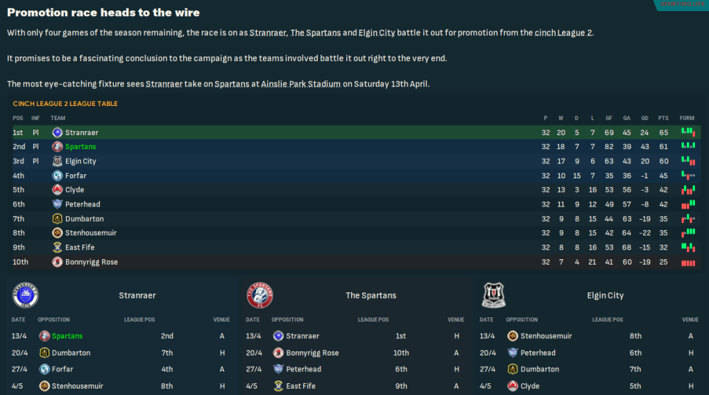 That lifted Spartans back into contention, moving them 2nd ahead of Elgin and 4 points behind Stranraer going into the final four games.