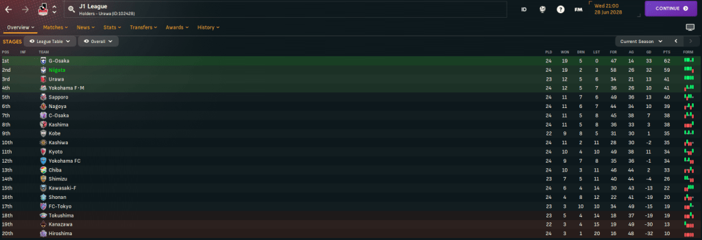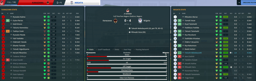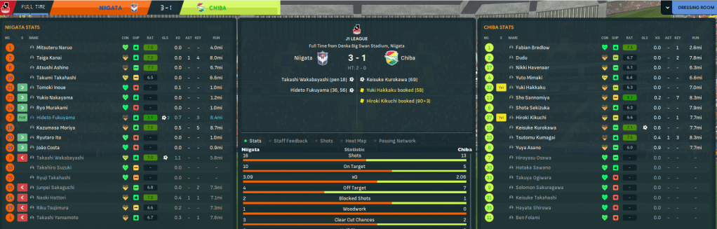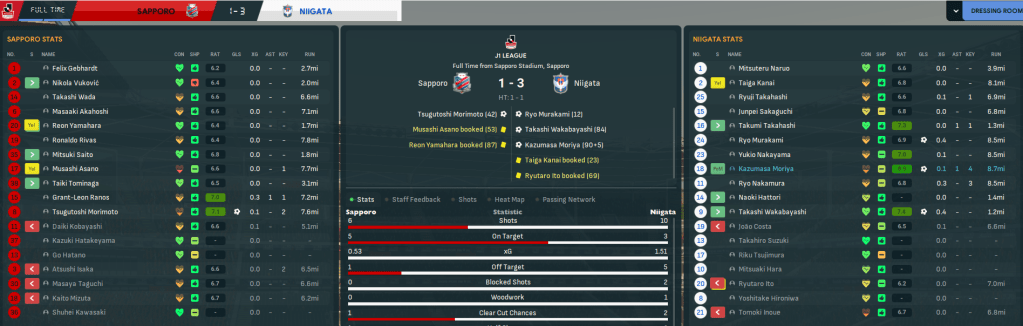 But the games caught up with Niigata and they finally lost their unbeaten start in their 15th game and a really poor match at Shimizu. That teed up two away days at Gamba Osaka, who remained unbeaten after 16 matches, then 3rd-place Sapporo within three days of each other.