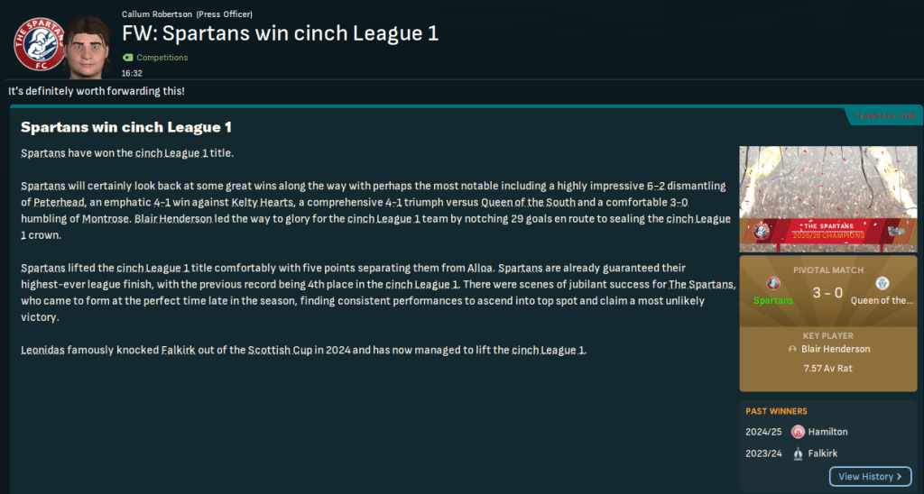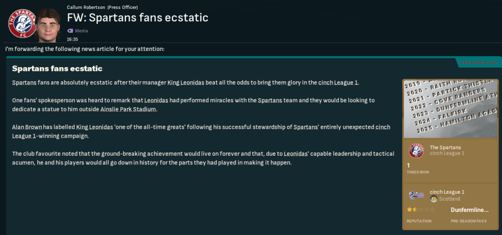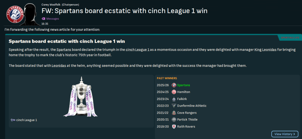 Spartans FC were in a great place heading into the second tier of Scottish football for the 2026/27 campaign, which sounded almost ludicrous to Leonidas as he enjoyed an expensive bottle of whiskey while discussing the terms of his new 3-year contract with Woolfolk. They now had over £1m in the bank and Spartans FC were headed for the cinch Championship!