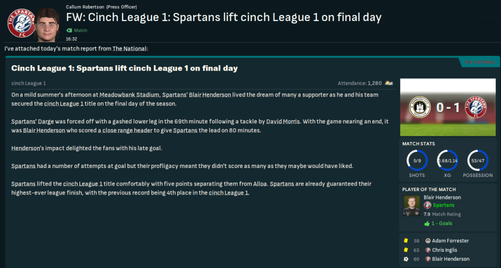 Airdireonians lost on the final day so Spartans won the title by 5 points from Alloa. They finished on 72 points from 36 games, with 30 wins, a league-high 12 draws and just 4 defeats, scoring 70 and conceding a league-low 30. Henderson was the best player in League 1, scoring 29 goals with 10 player of the match awards and a 7.57 average rating. But homegrown winger Graeme McGinley wasn’t far behind, getting a league-high 13 assists and a 3rd-best 7.37 average rating. While Max Currie topped the clean sheets with 16.