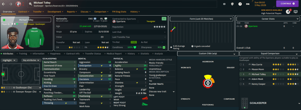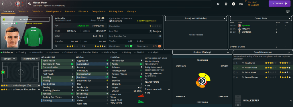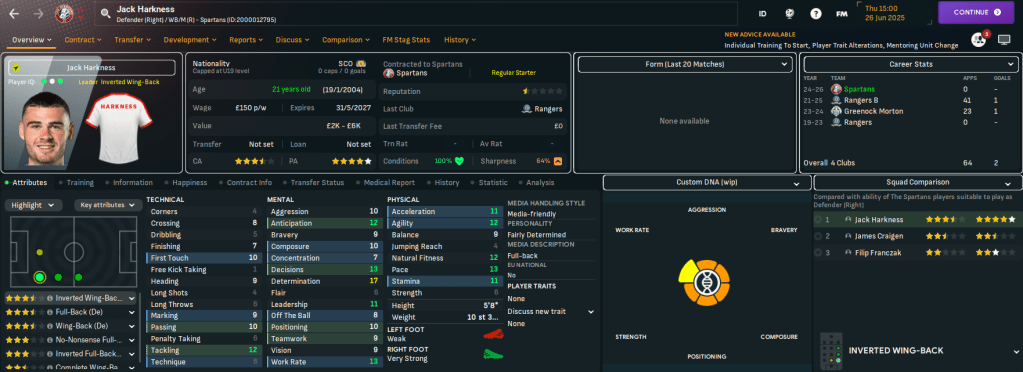 Leonidas largely stuck with the players that came so close to promotion and moved a few youngsters up into the first team. But he did make two free transfer signings in former Rangers right back Jack Harkness, who has 7 of Leonidas’ preferred Spartan attributes over 10 including 17 determination, and goalkeeper Mason Munn, who has high determination, bravery and aggression.