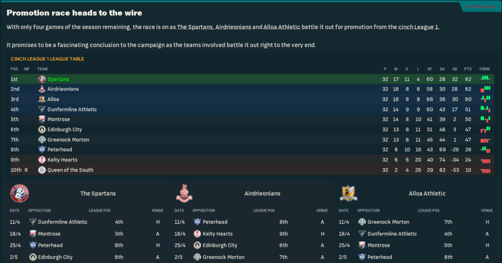 That sent Spartans top for the first time this season with 7 games remaining and, crucially, they’d already played the other top three sides for the final time. Next up were the bottom two and Spartans stayed top led by Henderson scoring a hat trick in a 4-2 win at QotS then a brace in a 4-1 thumping of Kelty Hearts. But a 1-1 at 6th-place Greenock Morton saw just 2 points separate the top 3 with 4 games remaining.
