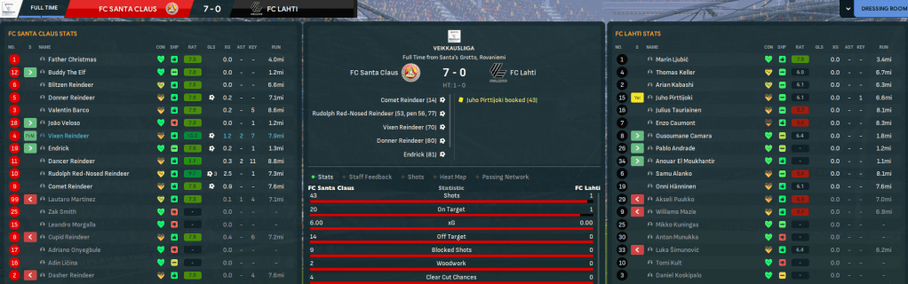 FC Santa Claus grew into the season, including a 12-0 and 48 shot annihilation of SJK, led by both Rudolph and Comet scoring hat tricks and Endrick and Lautaro braces, and a 10-0 win over AC Oulu in which winger Dancer Reindeer got goal and assist hat tricks. They went on to again win all 22 league games, scoring 141 en route, to win their maiden Finnish title before the Championsip Group began.