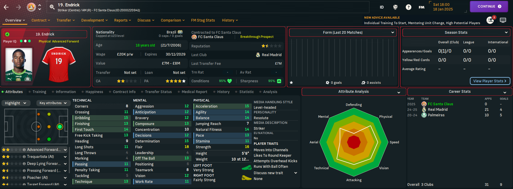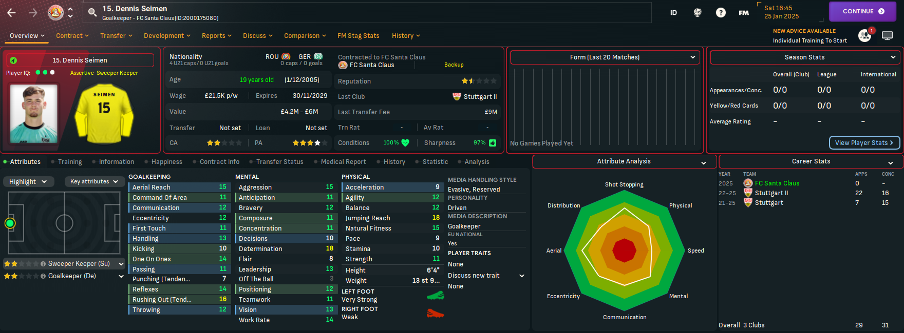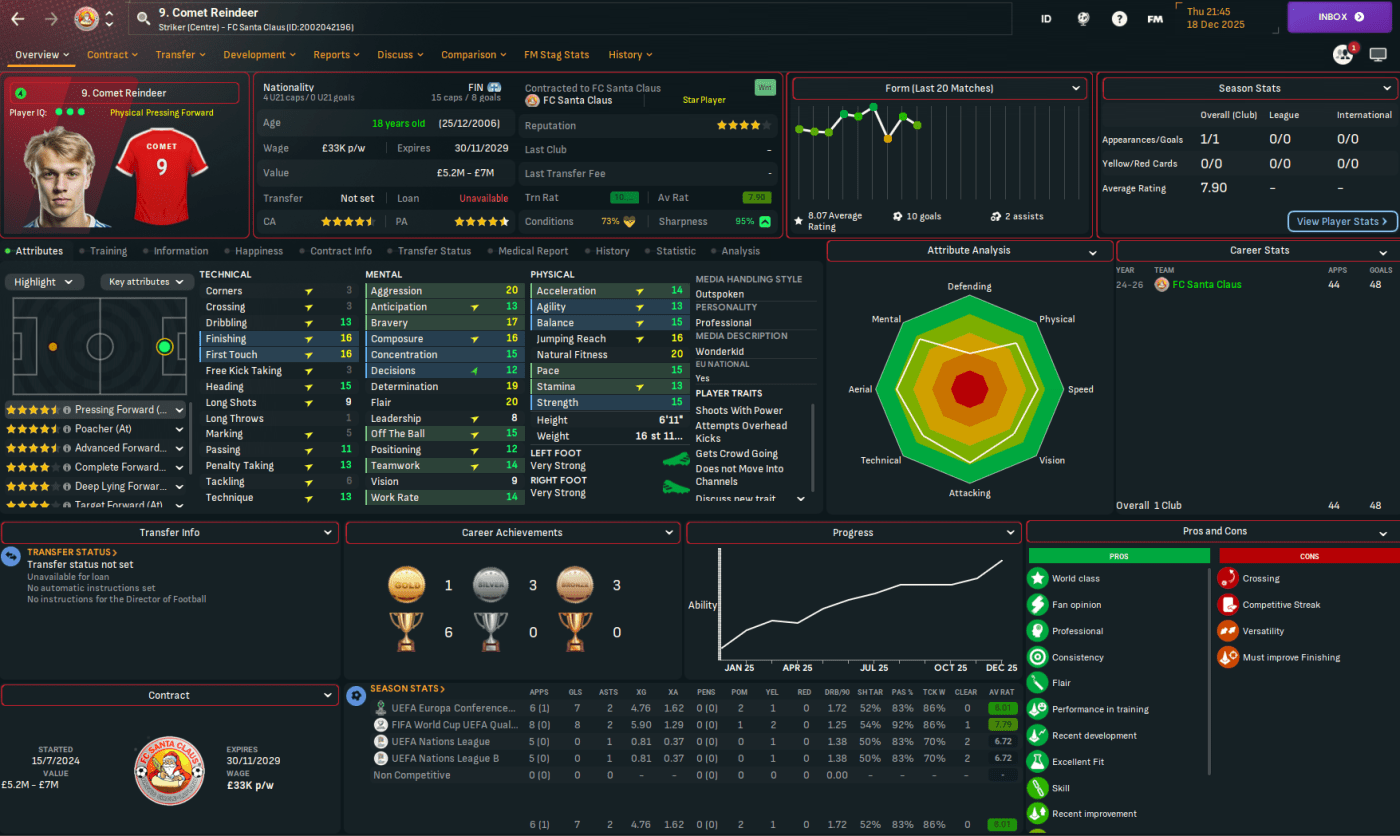 The young reindeer of FC Santa Claus had led the club into Finland’s top tier for the first time and sent the club into Europe for the 2025 campaign. Kris Kringle was very happy with his young team and chairperson Papa Elf was very happy with his manager with two exceptions: his inability to spend the club’s sizeable transfer budget and sign high profile players.