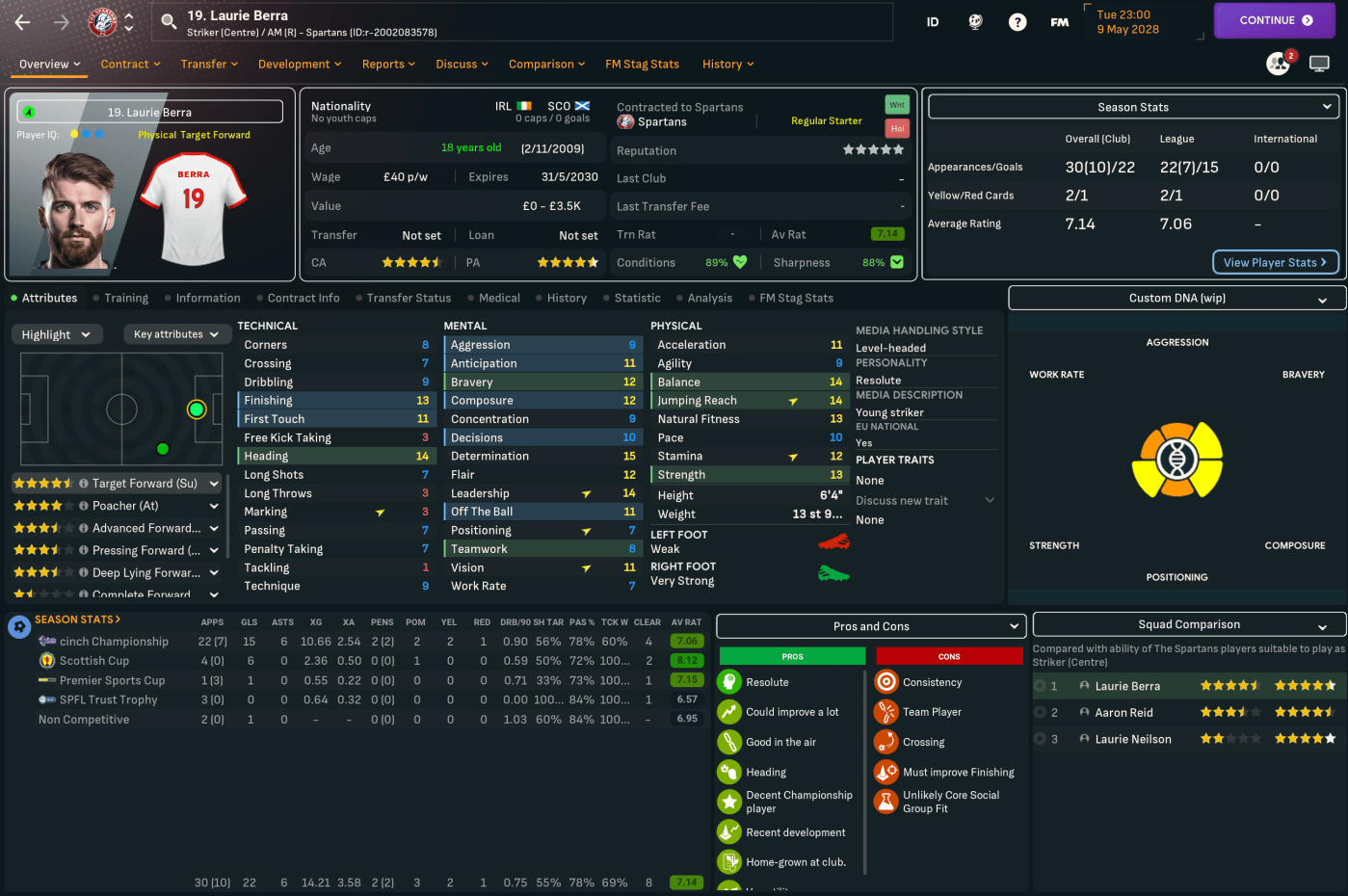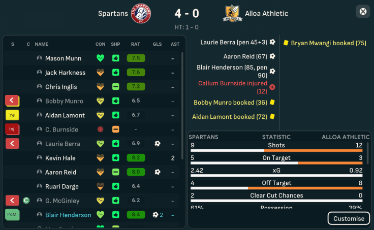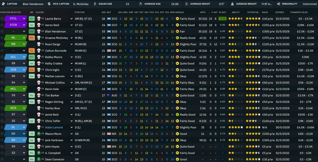 The transfer window again proved a struggle as very few players live up to Leonidas’ attribute requirements. They were forced to sell left back Aidan Lamont, who had one year on his contract, for a decent £100k to Motherwell, which was good considering they’d offered £2k for him in January. However, they did bring in a big burly striker in 6ft 3in Aaron Reid, who’ll provide competition for record goalscorer Blair Henderson.