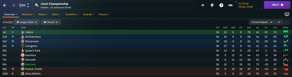 Game 8 – Airdrieonians (2nd, home): It didn’t get much easier as they faced promotion hopefuls Airdrieonians, who delivered with a 5-1 destruction after Darge got sent off for a shocking two-footer. That meant a Partick win would lift them above Spartans on goal difference… but they lost 3-0 at home to Kilmarnock.