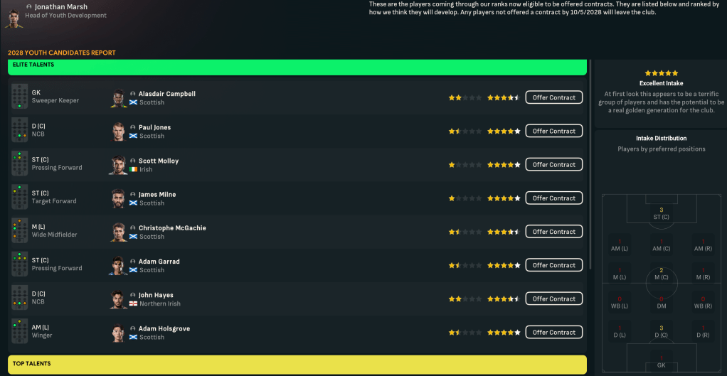 That said, there remains plenty of promise at Spartans. That was boosted by another stellar intake that delivered 5 players with 5-star potential, 4 with 4.5-star potential and 3 with 4-star potential. The pick of the bunch may be goalkeeper Alasdair Campbell along with strikers Scott Molloy, James Milne and Adam Garrad and winger Adam Holsgrove.
