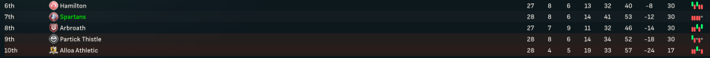 Game 5 – Livingston (4th, away): Spartans’ little flurry of points ended emphatically as they were hammered 4-1 at Livingston, whose striker scored a hat trick and earns 5 times more than Spartans’ top earner. Arbroath and Partick drew 1-1 and Hamilton drew 2-2 at home to Alloa, which left 6th to 9th split by just 3 points with 3 games remaining.