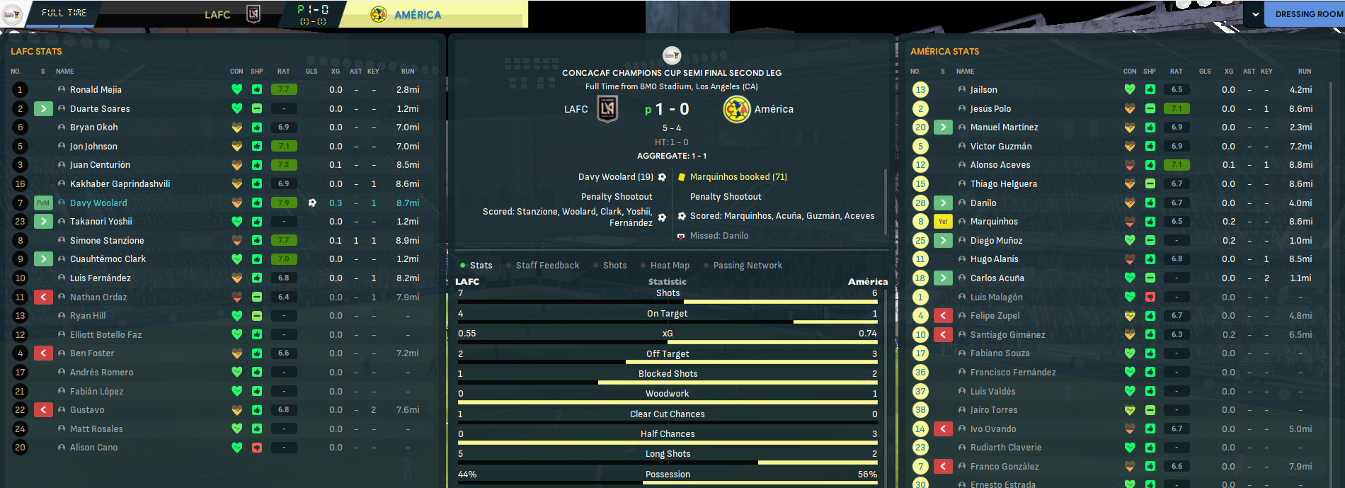 Back in LA, Stanzione teed up Woolard to level up the tie on 19 minutes. Nothing else happened, despite Rasamu pushing his boys forward, until América hit the bar with a header in the final minute. So it finished 1-0 and went straight to the lottery of penalties. Both sides scored their first two but Mejía saved Danilo’s tame effort chipped straight at him. Clark took advantage then América’s centre-back and Yoshii both converted. América scored their fifth to heap the pressure on Fernández, who seemingly didn’t feel it as he tucked it calmly into the bottom right corner. LAFC were into the Champions League Final!