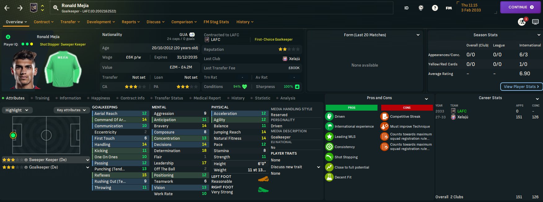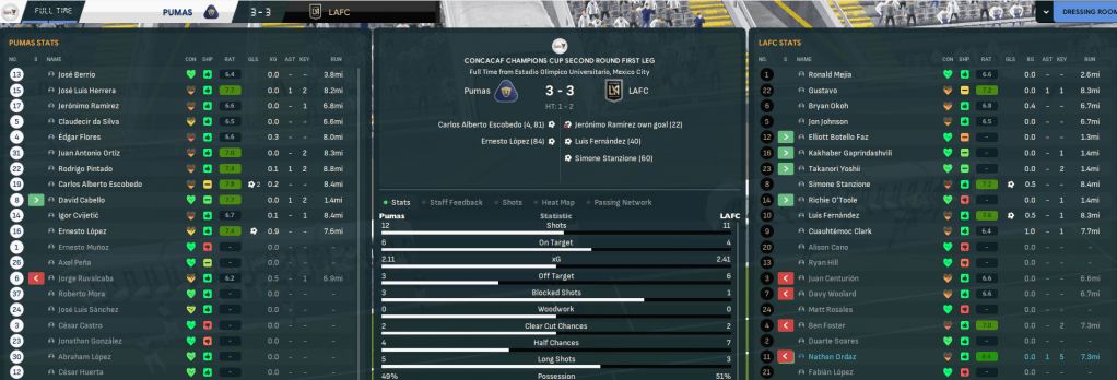 The 2033 season began with Rasamu’s first taste of his second continental trophy as LAFC entered the first round of the CONCACAF Champions League. LAFC’s opponent, ironically having just stolen their goalkeeper, was Guatemalan side Xelajú. It didn’t take long for Rasamu’s first goal as LAFC boss as Stanzione teed up Woolard to slam home. That opened the floodgates as Foster and Johnson, Foster and Woolard doubled their tallies, Stanzione made it six and Fernández bagged his debut goal. Mejía somehow conceded three times and they strolled to a new club record highest scoring match! A more controlled 3-0 win followed for a 10-3 aggregate success.