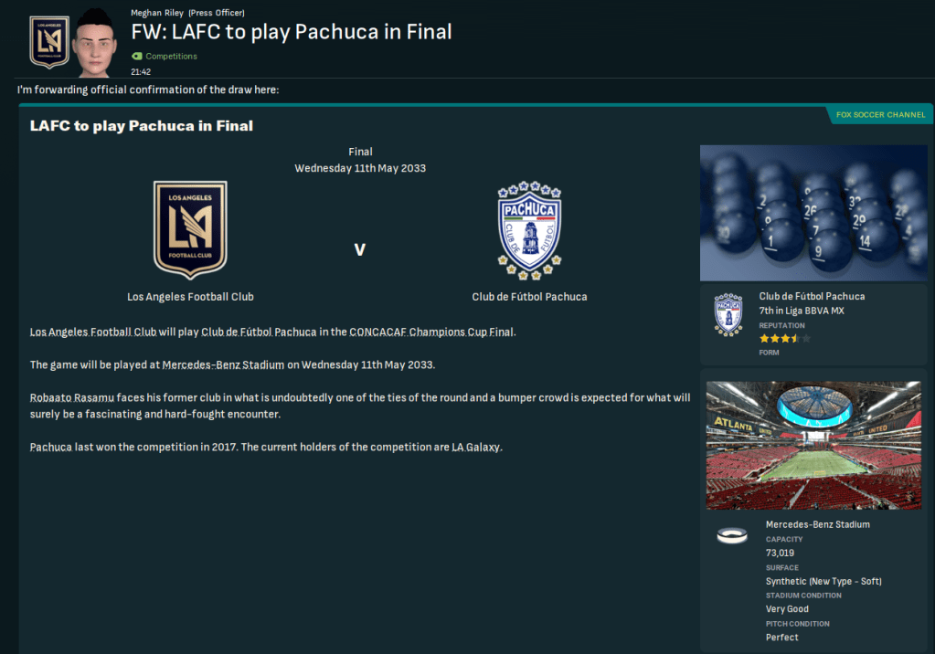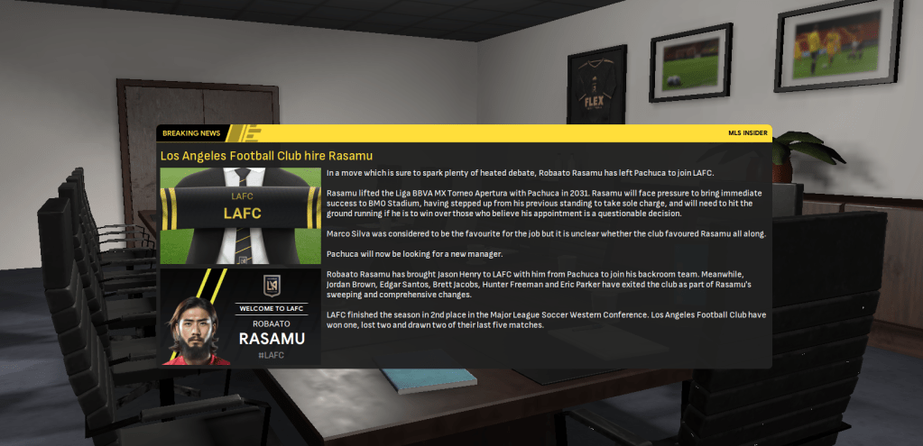 This chaotic welcome was the latest event in Rasamu’s absolute whirlwind of a few days. After nine years as a Football Manager, on 14 December 2032 he’d received arguably the biggest opportunity of his career as Major League Soccer side LAFC came calling. Since then, he’d had messages of support from people all over the football world, including Manchester City manager Pep Guardiola sending a short but sweet WhatsApp to wish him good luck. Rasamu was pretty overwhelmed by the reception, especially the wild press conference that saw him announced to the Los Angeles media.