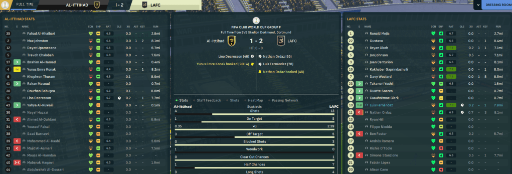 Madrid beat Al-Ittihad 3-0, so if LAFC could draw with the Saudis they would qualify for the knockouts. In Dortmund this time, nothing happened in the first half but the Saudis went ahead 30 seconds into the second. That proved to be their only real attack as LAFC woke up, levelled through winger Nathan Ordaz and went in front thanks to Fernández’s smart finish.