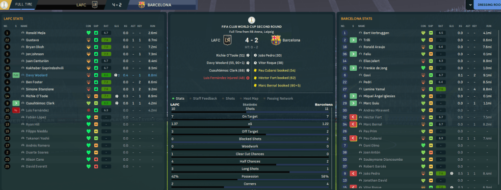 That meant they were destined for a tricky second round tie and so it proved, as LAFC were paired with Barcelona. The Spanish giants, still managed by Xavi, have the likes of Gavi, Pedri, Lamine Yamal, Vitor Roque, and another new city was ticked off as they travelled to Leipzig for another shot at nothing. LAFC lost Ordaz to suspension and this time there was no chance of an upset as Barca dominated, went 2-0 up through Joao Pedro and Roque then injured Fernández.