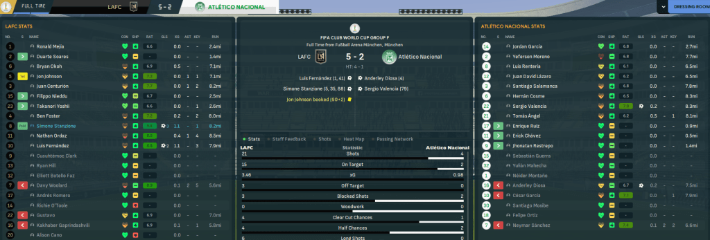 A few days later in Munich, they were up against Nacional and LAFC got a flyer as Fernández scored in the attack straight from the kick off. But they instantly conceded then immediately retook the lead from the resulting kick off through Stanzione! The game calmed down a little but Stanzione and Fernández doubled their tallies to take them into half time 4-1 up. And Stanzione wrapped up his hat trick late on to seal a 5-2 victory.