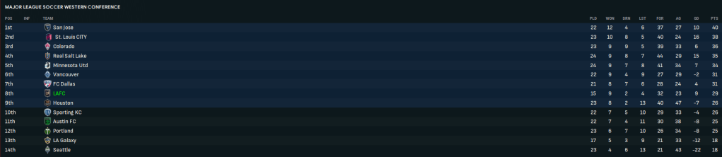 A 3-1 opening day win over Portland was followed by 3-1 defeat at NYRB, then four consecutive wins were followed by three straight defeats to Austin FC, Real Salt Lake and Inter Miami. But Clark’s goal to down Eastern leaders Colombus Crew 1-0 left them in 3rd just two points behind Western leaders San Jose. And, after the Club World Cup, they had seven games in hand and trailed San Jose by 11 points.