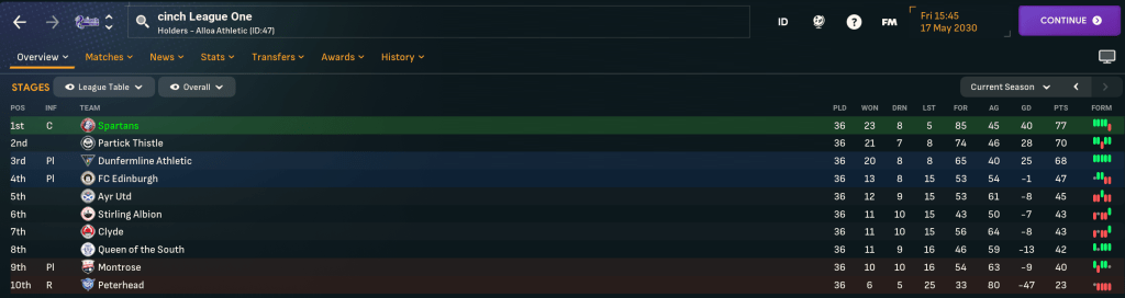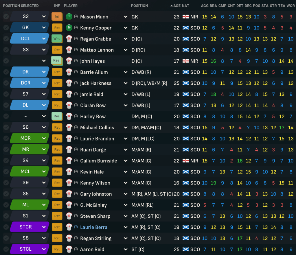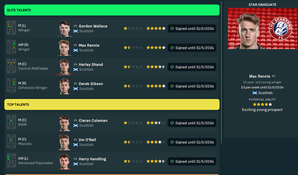 They also had a promising youth intake led by left winger Gordon Wallace, who was one of three 5-star potential prospects alongside right wingers Max Rennie and Derek Gibson plys 4.5-star potential midfielder Harley Shand and another winger Harry Handling (who would have made a great goalkeeper). Additionally, the U18s side won the U18 Scottish Tier 3 at a canter, wining the title in March and by 12 points, so there’s plenty of promise at the club.