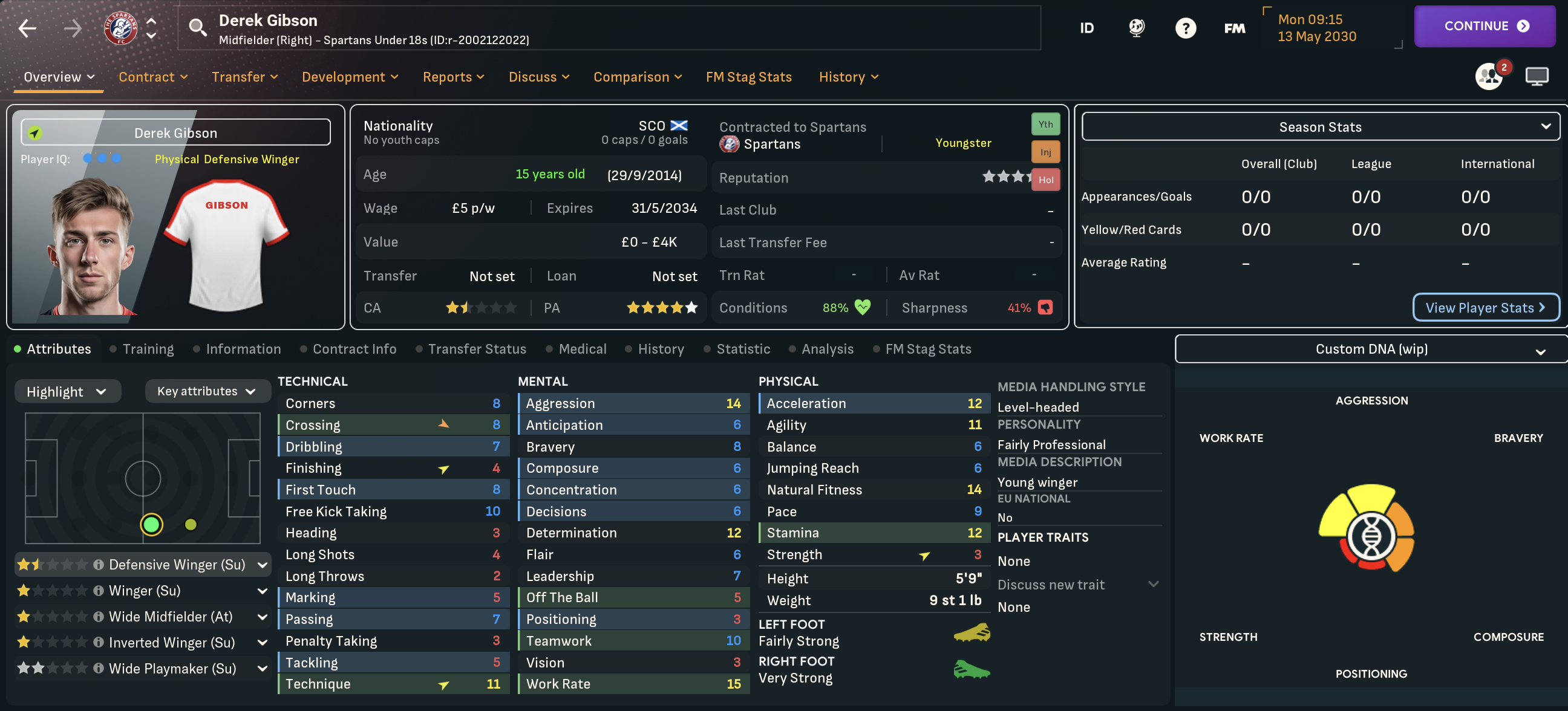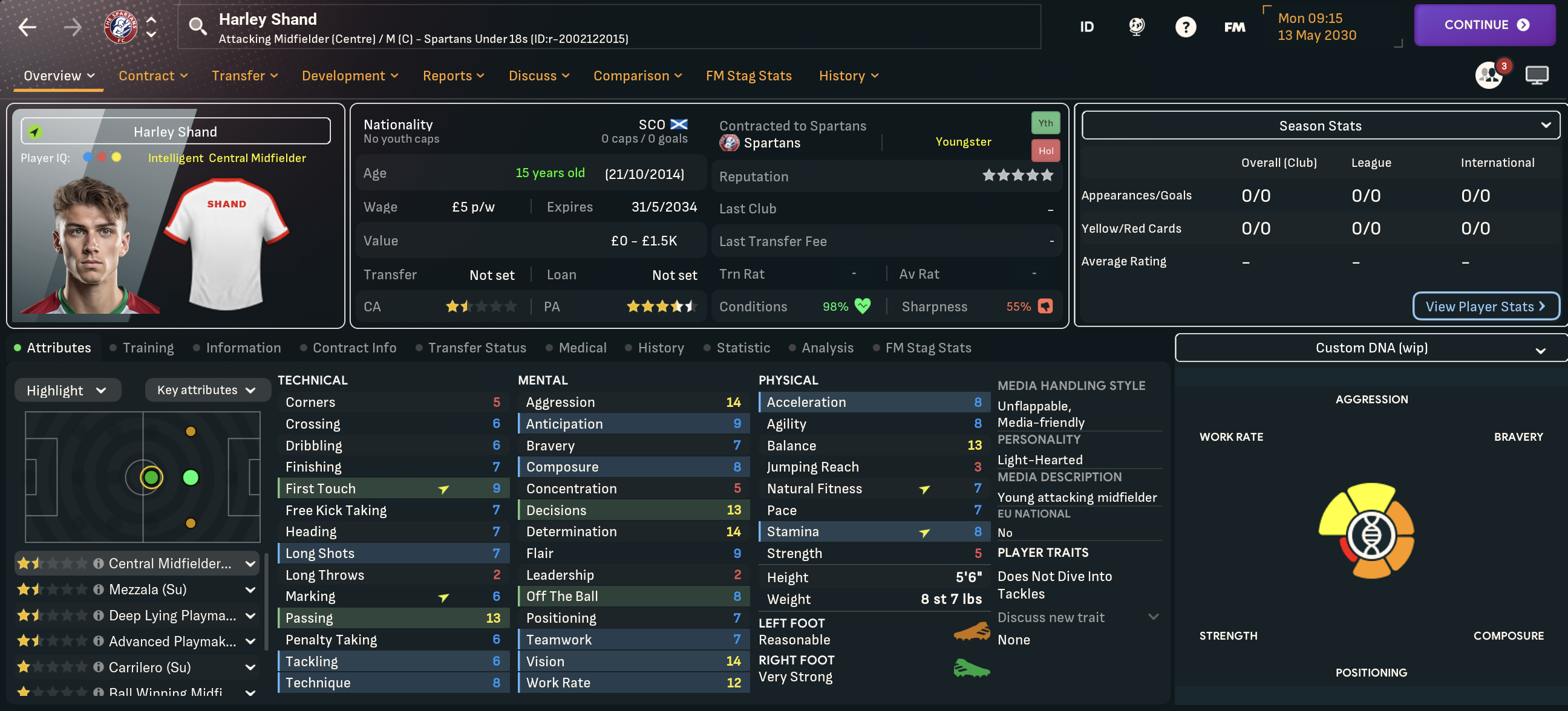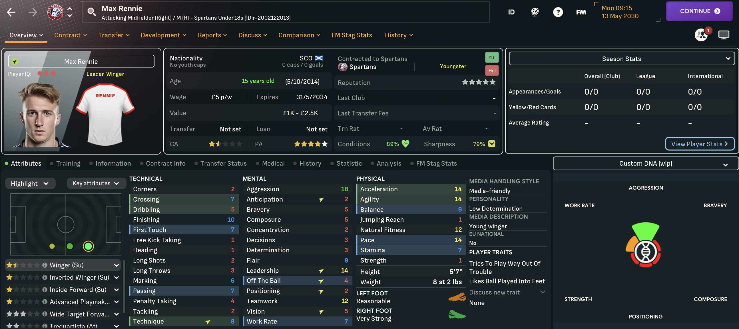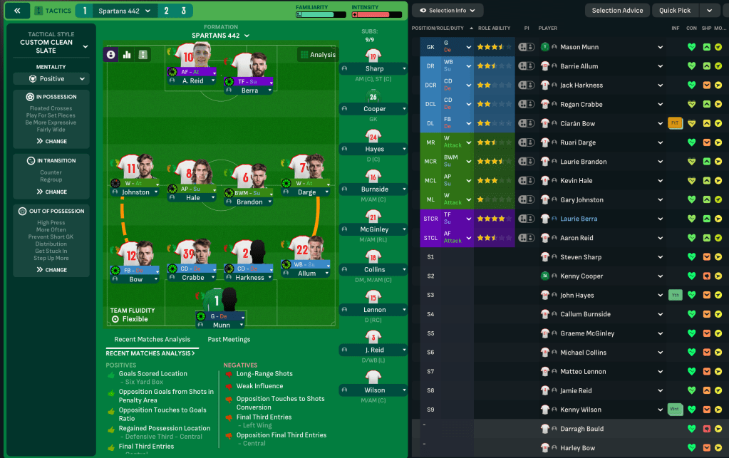 Leonidas’ 6th season at Spartans began by selling another homegrown prospect. They were forced to move striker Laurie Berra on to Falkirk for £50k with a 50% of next sale clause, but got him back on loan for free. Another hot prospect was promoted in 15-year-old midfielder Kenny Wilson, who’s retraining as a left winger, along with striker Regan Stirling and centre backs Regan Crabbe, who improved on loan to become a starter, and Matteo Lennon.