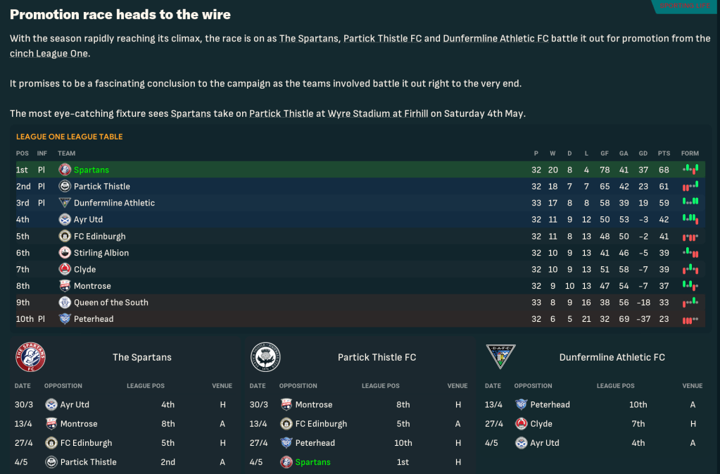 After two games without scoring, they put that right with a 5-3 win at home to Clyde led by a Berra brace. Not to be outdone, Reid scored twice in a 3-1 win at Ayr to quickly extend their lead to 9 points. But that was slashed as Spartans drew at FC Edinburgh then lost 2-0 at home to Partick and struggled to a 0-0 at home to Stirling. A 2-0 win at Peterhead thanks to second-half Reid and McGinley strikes got them back on track, before a 0-0 at Queen of the South and a 4-3 loss at home to 3rd-place Dunfermline. But Partick also suffered a drop in form, leaving Spartans 7 points clear heading into the final 4 games, which included a potentially tasty trip to Partick on the final day.