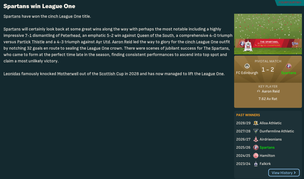 Spartans celebrated the title success with a 1-0 win over rivals FC Edinburgh before a final day defeat at Partick. But they finished the season on 77 points after 23 wins, 8 draws and 5 defeats, scoring a league-high 85 goals and conceding 45. Reid set a new League 1 goals record of 32, surpassing Blair Henderson’s tally of 29 in 2026, scoring a goal every 88.4 minutes and outperforming his xG by more than 10, followed by Berra on 21. The two strikers also had the highest average ratings in the league with Reid on 7.56 and Berra 7.42. Also worth a mention is Mason Munn, whose 76% save percentage was the best in the league, and McGinley’s 15 assists was only bettered by Partick’s James Tilley. As a result, Reid won League 1 Player of the Season and Leonidas won Manager of the Season.