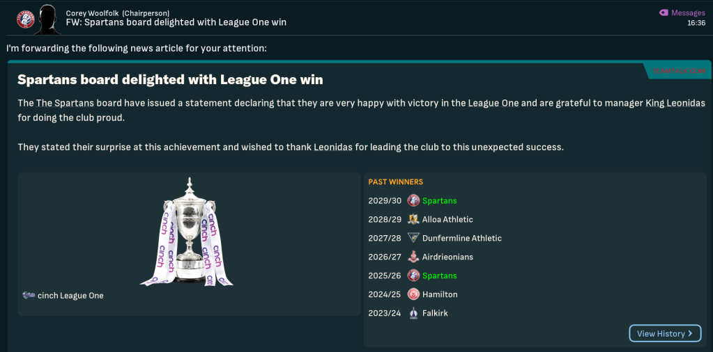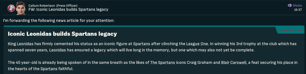 Relegation is always a bitter pill to swallow. But in the case of The Spartans, it was always likely to come. King Leonidas, never one to get downheartened by a little misfortune, viewed the return to League 1 as an opportunity to realign, strengthen and weed out any bad eggs in his changing room. And he was keen to ensure none of his players “got a grumpy on,” working them harder than ever in the summer of 2029.