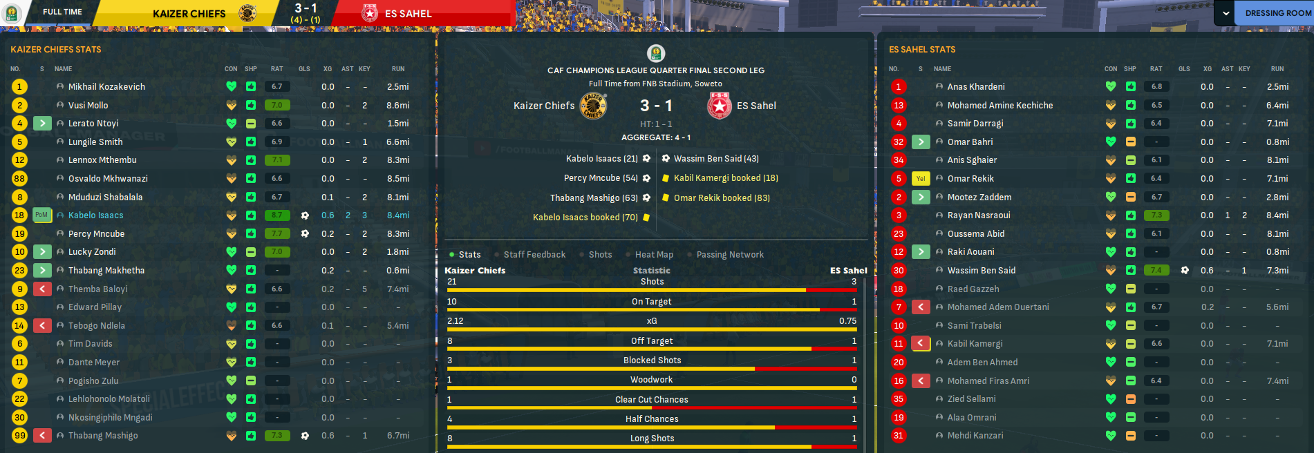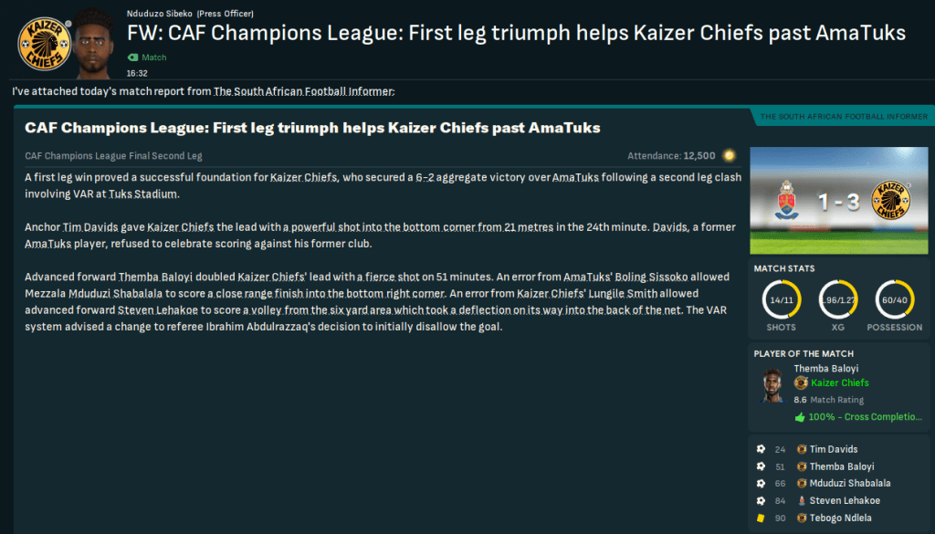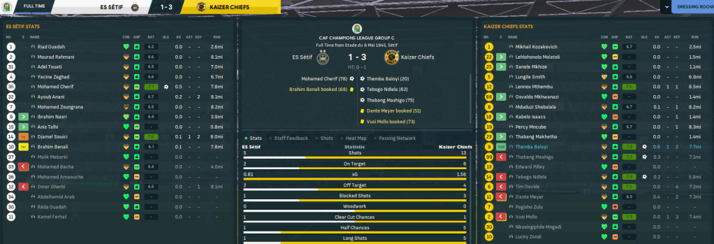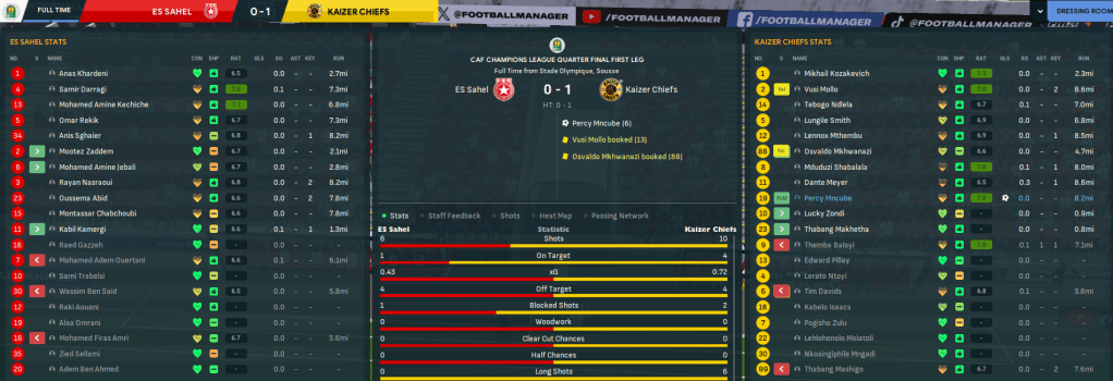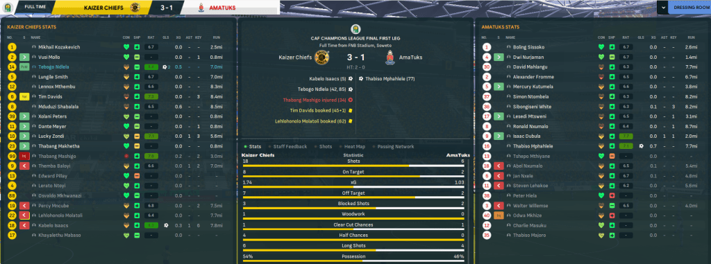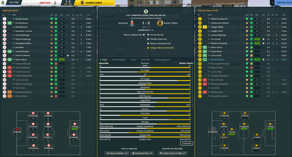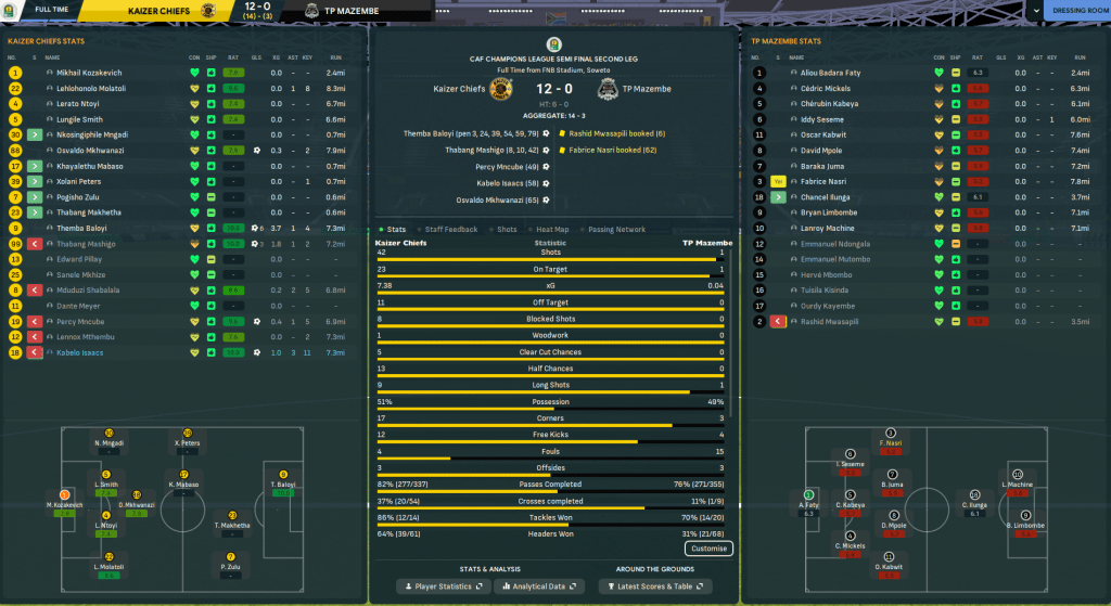 One week between legs was enough time for Rasamu to calm down and refocus his players to go and get revenge. And his players were clearly equally angry. The tables fully turned as, after three minutes, Chiefs won a penalty that Baloyi converted. It was soon 3-0 as Mashigo headed home twice in three minutes and the onslaught continued. Baloyi bagged a fourth then curled in a free-kick for his hat trick, Mashogi headed home his hat trick goal then crashed another off the bar and Chiefs went into half time 6-0 up with 28 shots to zero! But they were far from done there. Mncube swiftly made it seven, Baloyi fired home from 25 yards, Isaacs headed home unmarked at the back post, Baloyi headed his fifth, holding midfielder Osvaldo Mkhwanazi got in on the act and Baloyi tapped home for a double hat trick. Chiefs settled for a 12-0 annihilation, having 42 shots to one and 7.38 xG to 0.04, to reach the Champions League Final in style.
