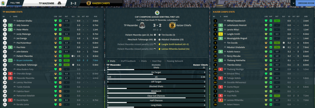 The semis saw Chiefs paired with TP Mazembe, three times champions in the 2010s. The away leg was first again, which meant a 2,600 mile round trip to Lubumbashi. Chiefs started quickly again, breaking from a Mazembe corner and holding midfielder Tim Davids curled a rare goal into the top corner. Mazembe were quickly given a questionable penalty, Mikhail Kozakevich saved it, then straight from the resulting corner were given another. A howitzer by midfielder Mduduzi Shabalala restored the lead before Mazembe quickly responded with a screamer of their own. Unbelievably, the ref gave them a third penalty that Kozakevich saved again then ruled out a Baloyi goal that looked onside. Mazembe, completely undeservedly, went and nicked it 3-2. The officiating was absolutely unacceptable and Rasamu accused them of match-fixing in his post-game interview.