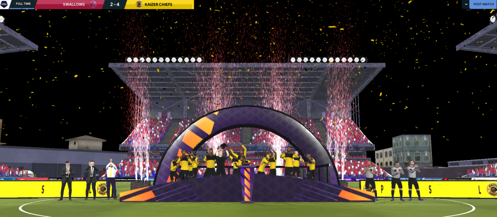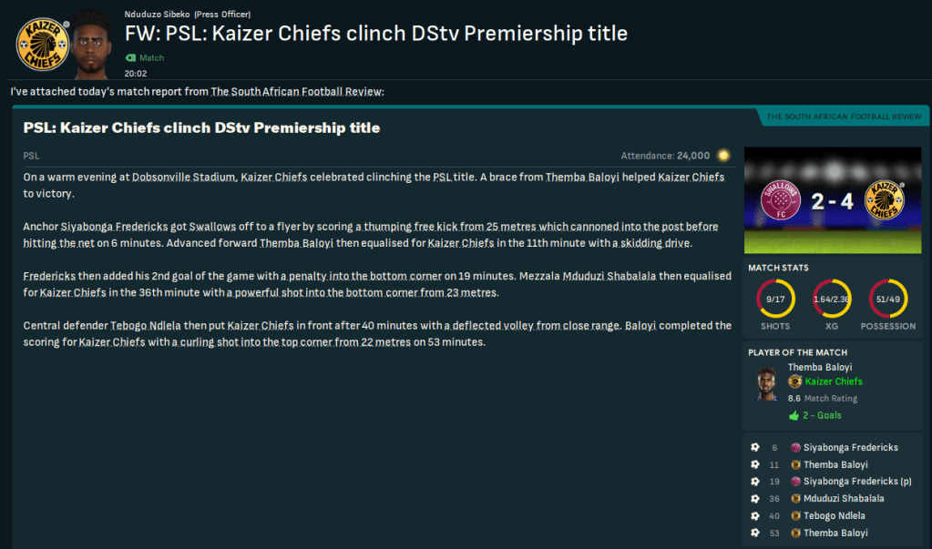 The good run continued through to gameweek 24 and a trip to Pirates three days before a Champions League game. Rasamu rotated and they lost 3-1, having missed a penalty. However, they remained eight points clear with six games remaining. Percy Mncube bagged a brilliant hat trick to down Polokwane City 4-1 before a 2-0 win at struggling Sundowns. That meant a win at 4th-place Swallows would secure the title and, despite a slow start, Chiefs bossed the game and a Baloyi brace led a 4-2 victory. Kaizer Chiefs were Champions of South Africa for the first time in 20 years!