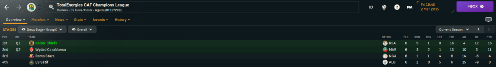 Chiefs came into the second half of their TotalEnergies CAF Champions League group with one foot in the knockouts. They resumed at home to 2033 winners Wydad Casablanca, got in front with a blistering counter attack finished off by winger Dante Meyer but Casablanca came back into it to draw 1-1 and keep Chiefs five points clear. Next up was a trip to Tunisia to face ES Sétif, where they got a good start as striker Themba Baloyi powered home a header. Their effective back-post corner was back in action as Tebogo Ndlela doubled the lead before exciting attacker Thabang Mashigo wrapped up a 3-1 victory.