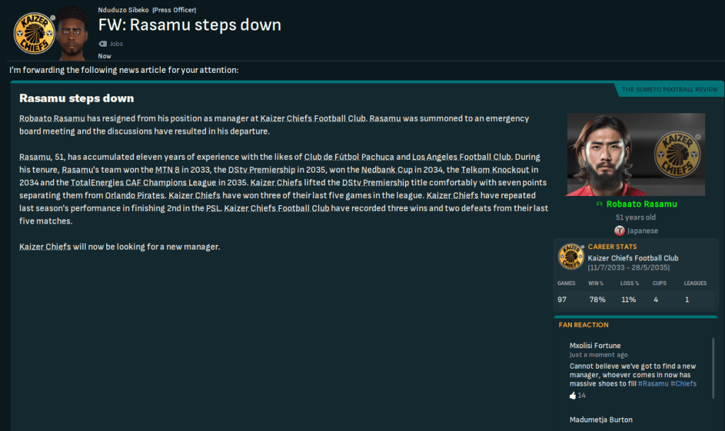 The magic touch of Japanese manager Robaato Rasamu was rubbing off on his Kaizer Chiefs side as they looked set to qualify from their African Champions League group and led the way in South Africa’s DStv Premiership. A welcome two-month mid-season break moving into 2035 gave Rasamu and his players a little time to recover, reset and refocus ahead of a huge few months.