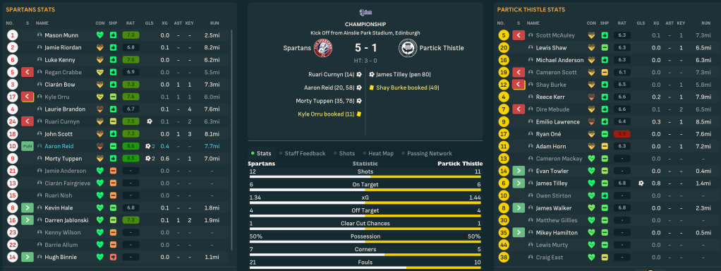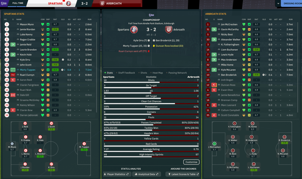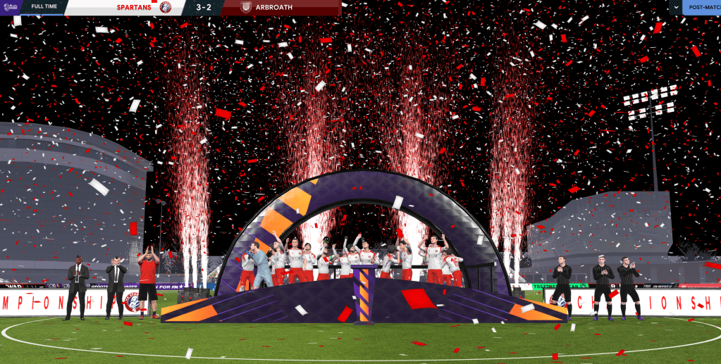Game 3 – Arbroath (8th, home): That meant Spartans’ first chance to reach the Scottish Premiership was in the Friday night game at Airslie Park Stadium against Arbroath. Leonidas told the lads to do it for the fans and his rousing words had the desired result as Brandon slid Orru in for the opener inside 7 minutes. Arbroath swiftly equalised from a corner, Spartans followed suit as a short corner saw Tuppen head home. They immediately gave up the lead but Tuppen quickly restored it as a short free kick was played into him by Scott. The 2nd half was a little calmer until Curnyn decided to chop a guy in half from behind with 13 minutes remaining. Leonidas went massively on the defensive… and it worked as they killed the game off.