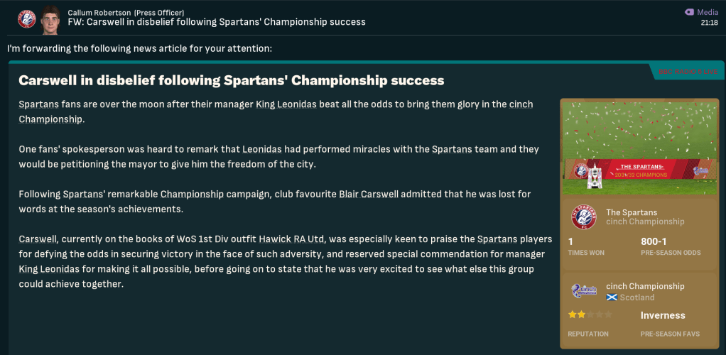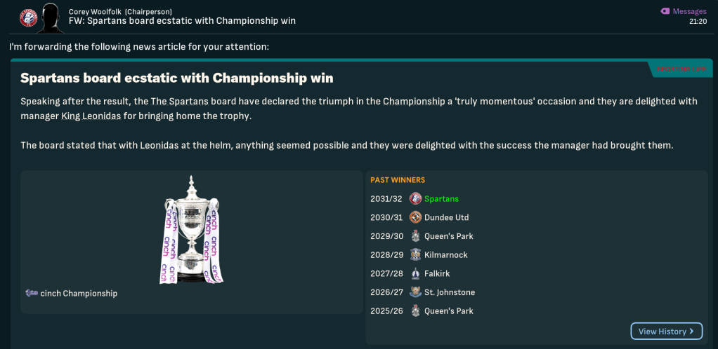 It had taken 9 years with one relegation along the way, but The Spartans were a few months away from stepping up to the top tier of Scottish football. Could they mix it with Scotland’s best? And would there be finances available to help Leonidas strengthen his squad? Join us next Wednesday to find out!