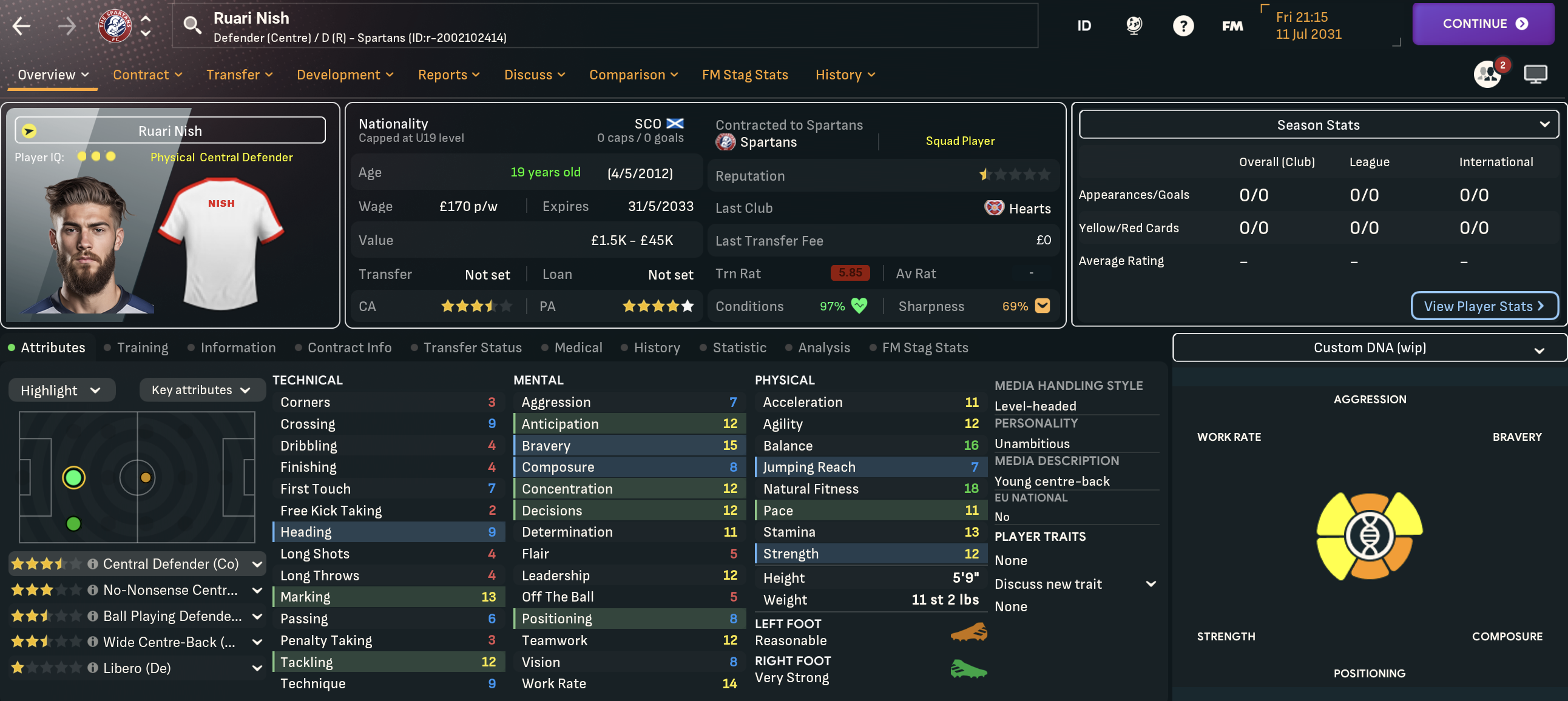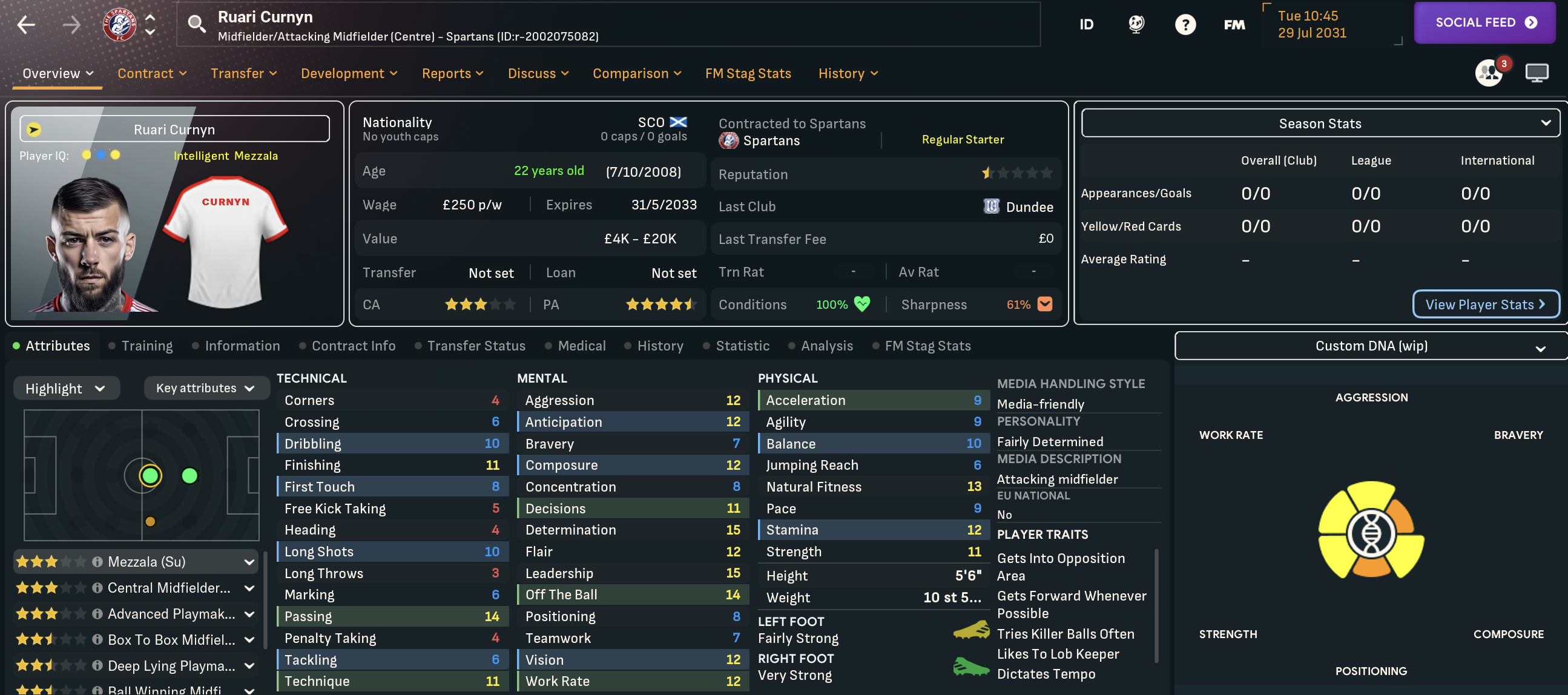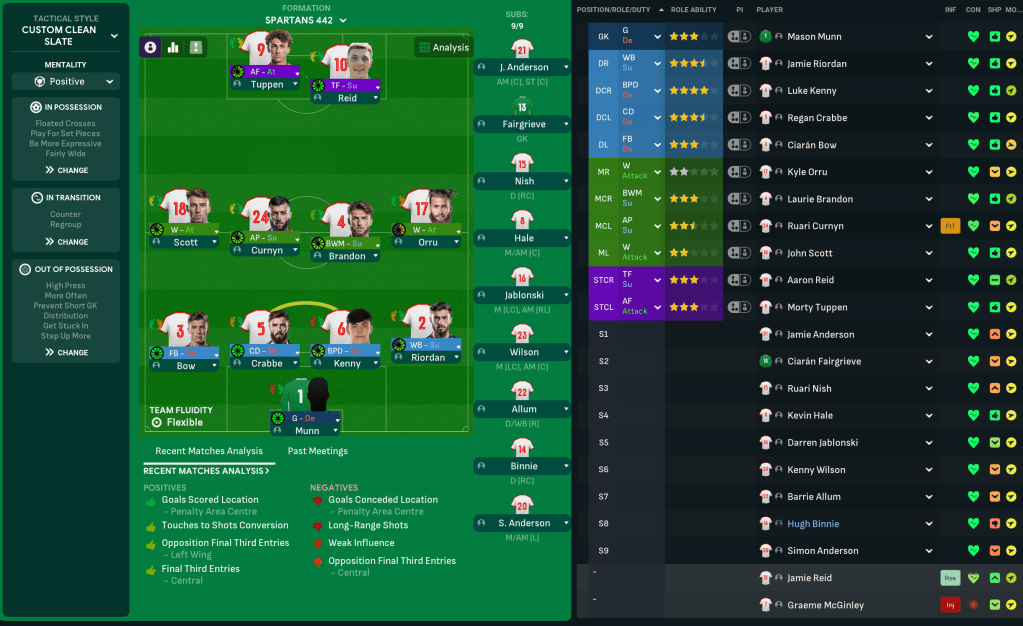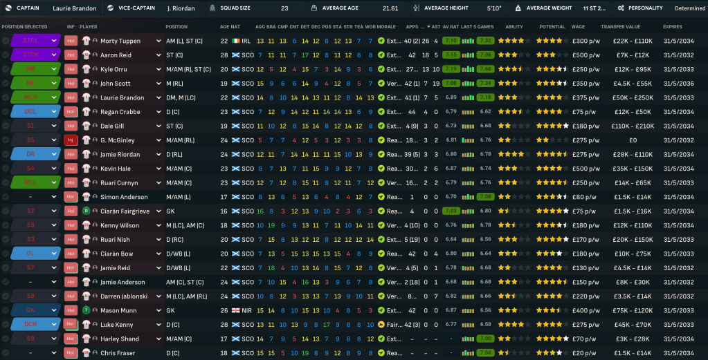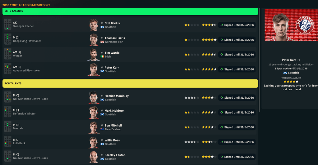 The Spartans’ summer began with the board deciding to blow £1.6m on new youth facilities – leaving them with £350k in the bank! That left King Leonidas with no option but to continue to focus on free transfers. He began by signing two familiar faces as right back Jamie Riordan and midfielder Ruari Curnyn, who left for Dundee United and Dundee in 2025 and 2027, rejoined after being released. They were joined by centre backs Ruari Nish and Hugh Binnie, and Leonidas promoted academy products striker Dale Gill, wingers John Scott and Simon Anderson and goalkeeper Ciarán Fairgrieve.