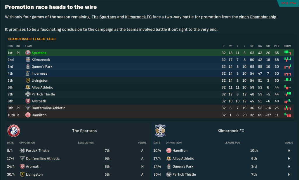 Reid was the saviour again as he scored the only goal at home to bottom-side Hamilton while Kilmarnock drew at Livingston. And Spartans drew their game in hand 2-2 at Alloa to go 10 points clear with 5 games remaining. However, the unbeaten streak ended dramatically with a 4-1 hammering at home to Queen’s Park. That left it as very much a 2-way battle with Spartans 7 points clear with 4 games remaining.