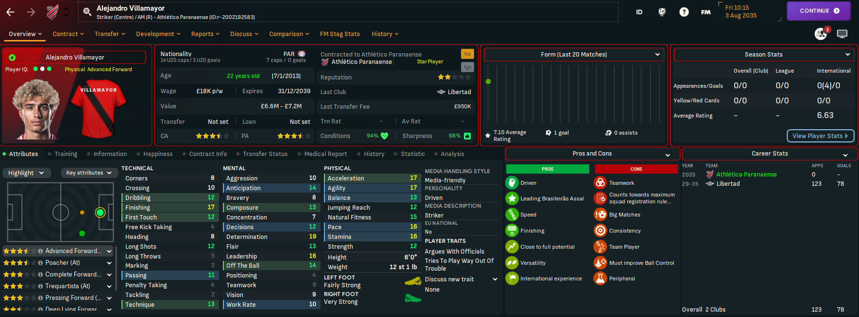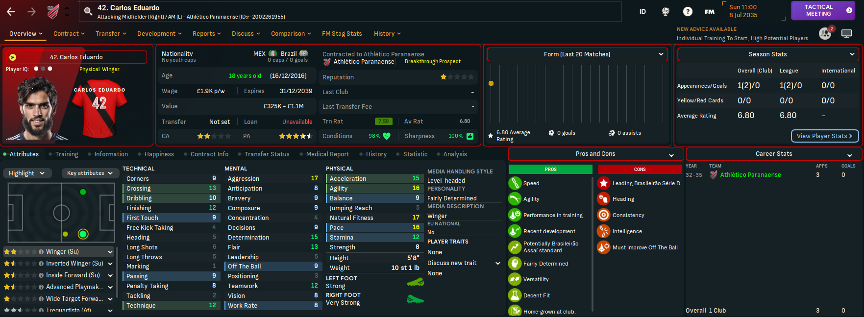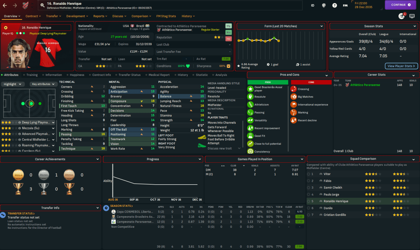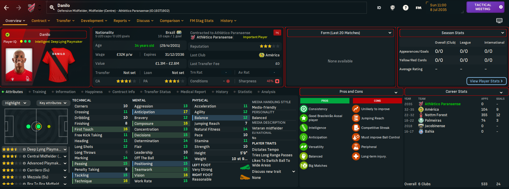 The best player at Paranaense is rapid winger Reinaldo Strada, who’s the only player to have 4-star ability but has oddly only played six games this season. Other key players will be centre back Carlos Bruno, striker Tom and midfielders Ronaldo Henrique, Danilo (the former Forest player) and Fábio. There’s potential in 17-year-old midfielder Lucas Pena Barcelos, winger Carlos Eduardo, right back Yago and Moroccan striker Khalid Ennafati and midfielder Samir Cheikh. The youth teams also had nine players with 4.5-star potential or better led by centre-back Evaldo, midfielder Anderson and winger Paulo Roberto Aal. Rasamu arrived at Paranaense two days before the transfer window opened and wasted no time in selling 10 players for £2.5m then signing Paraguayan striker Alejandro Villamayor for £950k.