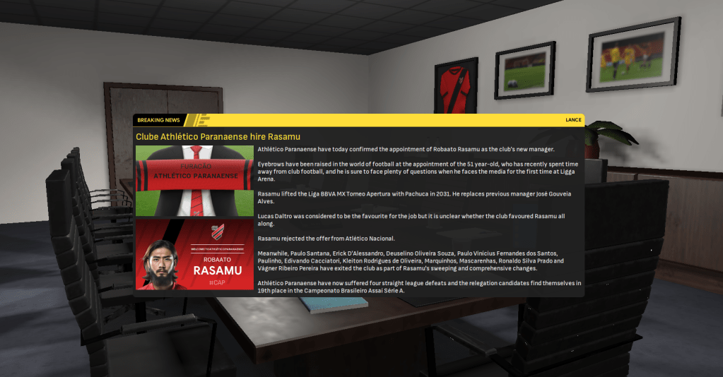 He applied for all the vacant roles and quickly received interview offers from Paranaense, Fortaleza and Nacional – who all moved quickly to offer him the chance to move to South America. Rasamu delayed all three offers as he now he had a big decision to make. He was tempted by Nacional’s 20 youth recruitment and solid finances with £12m in the bank but then didn’t really fancy the carnage that is managing in Colombia. While Paranaense seem to be in a good place financially and also have decent infrastructure and managing in Brazil is slightly less chaotic.