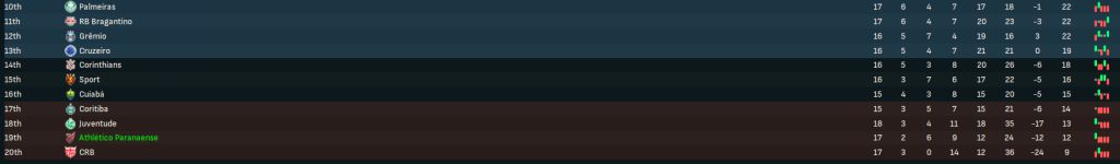 The good start continued with back-to-back 0-0s at home to 5th-place Bahia and another Athletica Derby at Coritiba but they eventually lost 2-0 at Fluminense then 2-0 at home to Internacional. A run of must-win games against fellow bottom half sides began with a much-improved 4-2 win at Cruzeiro in which Villamayor got his first goal for the club and young winger Eduardo got two assists. And the young duo impressed again as they scored in a 2-1 win at home to 16th-place Cuiabá then a superb 4-1 win over Santos in which Tom halted his 13-hour goal drought.