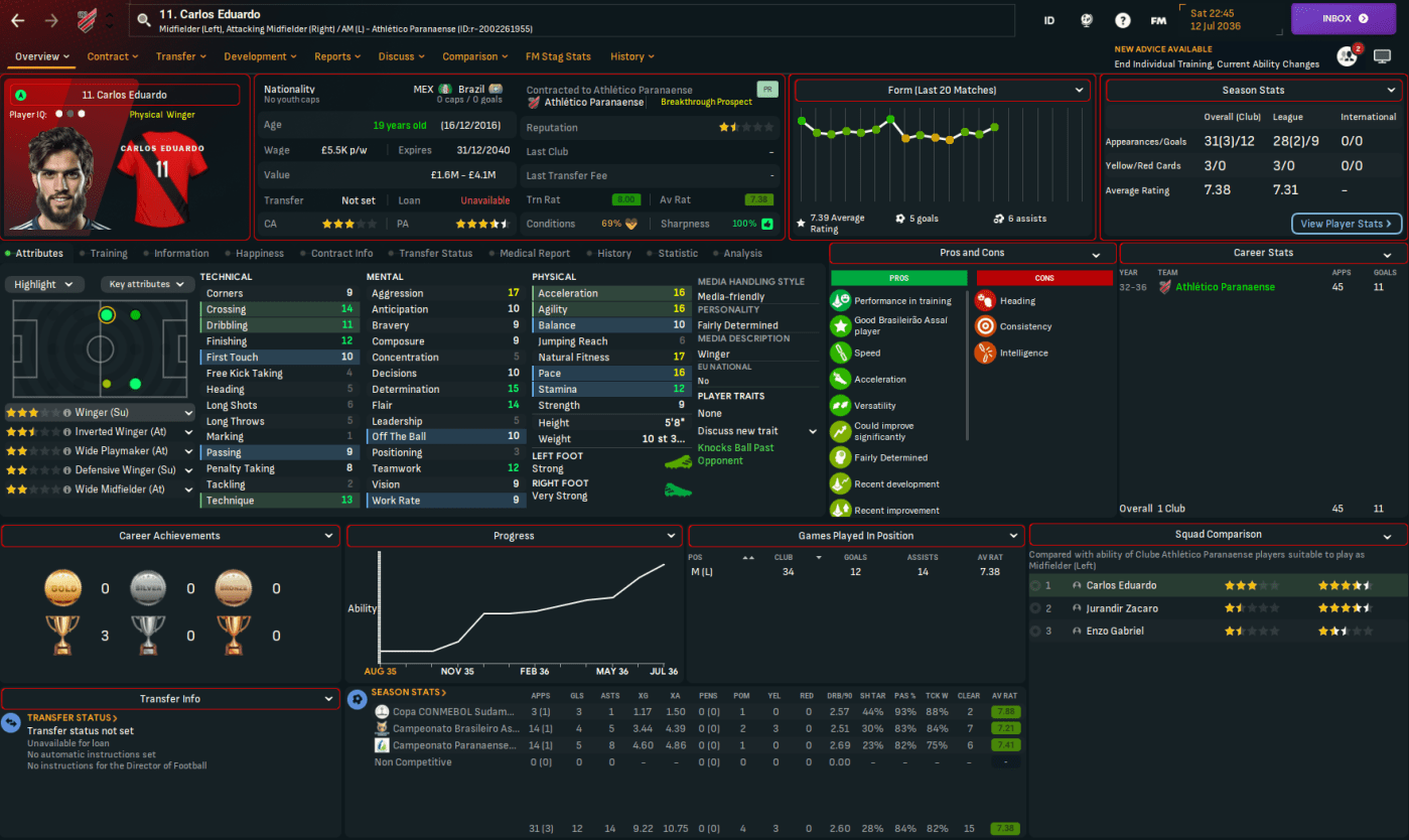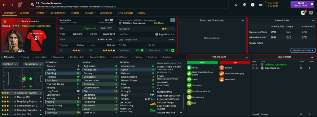 At the end of the 2035 campaign, he wasted no time in transfer listing a mass of players he didn’t want to work with. He sold 22 players for a profit of £46m, including irritating striker Tom and centre back Carlos Bruno going to Saudi for £11m and £12.5m and wantaway midfielder Vítor joining Santos for £5m. That also freed up more than £200k from their weekly wage spending.