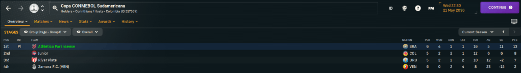They began at home to River Plate and eased to a 3-0 win through Aguilar, Eduardo and Villamayor, who then scored the only goal at Junior before a rotated side also 3-0 win at River Plate led by a Pipoca brace. A 7-1 battering of Zamora secured qualification so Rasamu rotated and they finished with a loss and a draw but easily topped the group.