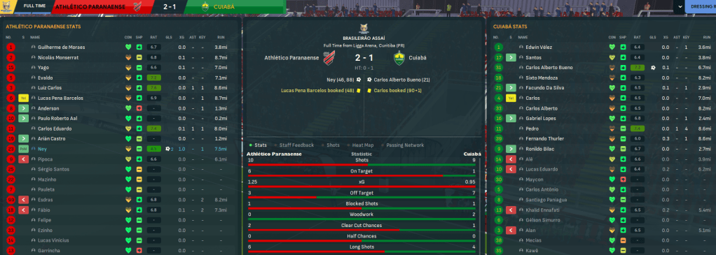 Rasamu’s exhausted squad, many of whom had already played 40 games in six months, finally got a 15 day break between matches so the manager gave them all a week off. And it looked like they’d relaxed a little too much as Cuiabá scored a total fluke and led with, no surprise to anyone, their only shot on target. But a half time talking to inspired a comeback led by striker Ney’s brace.