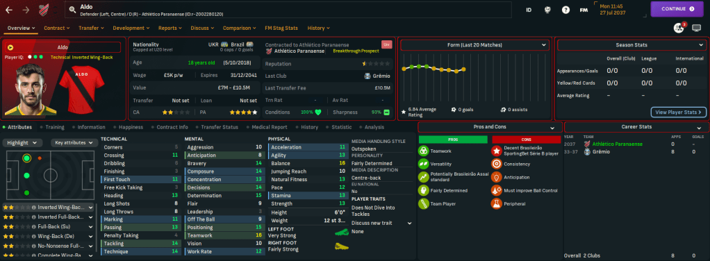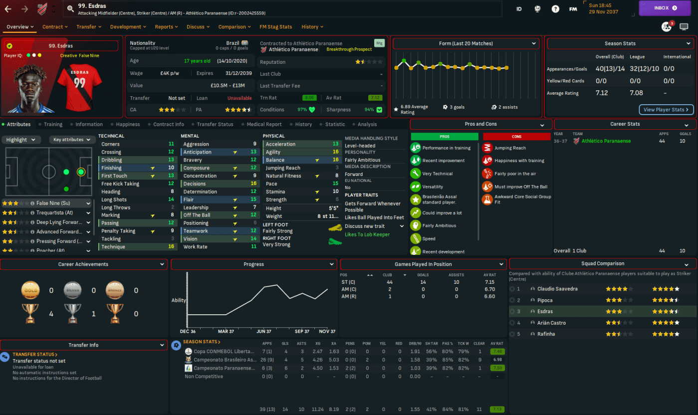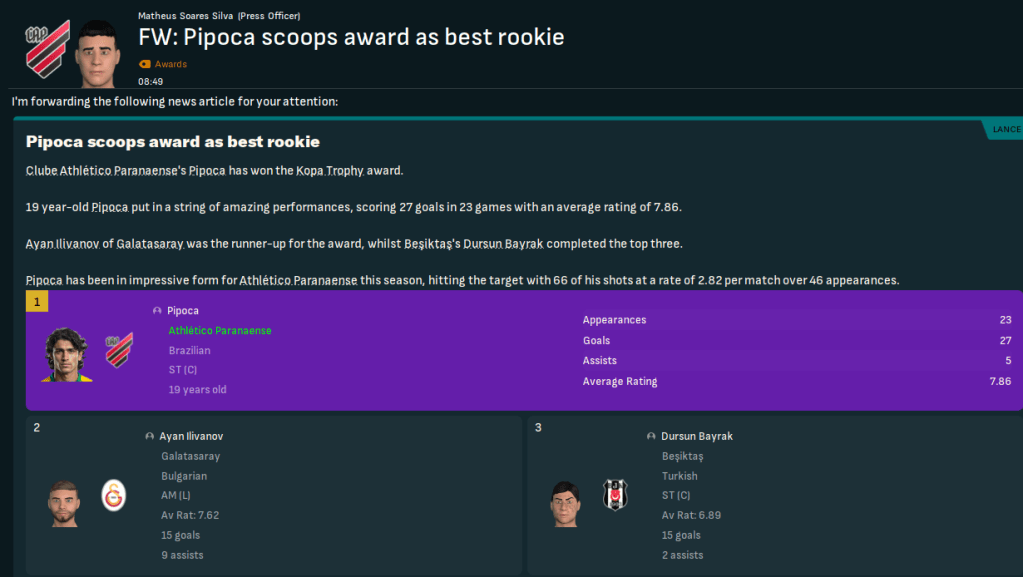 Despite the continental disappointment and falling away a little in Série A, Rasamu was loving life working with the exciting young talents at Paranaense. His personal favourite was Pipoca, whose potential was highlighted by winning the Kopa Trophy 2037, aka U21 World Player of the Year.