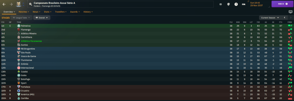 Given that mass of potential, Rasamu had turned to youth in the first half of the 2037 campaign. And he’d been rewarded by 18-year-old striker Pipoca already scoring 31 goals, 16-year-old striker Esdras scoring 11 with eight assists, 20-year-old winger Carlos Eduardo scoring 11 with 12 assists and 18-year-old winger Paulo Roberto Aal scoring eight goals and getting 17 assists.