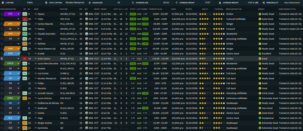 The manager further focused on youth by selling defender Fransuar and underperforming striker Alejandro Villamayor to Saudi for £5m and £19m. Unfortunately, Real Madrid came in for 29-year-old goalkeeper Elivélton Colaco and Lazaró was forced to negotiate them up to £23.5m, which saw the club’s bank balance move past £100m for the first time. Those sales forced Rasamu into the transfer market, signing two 18-year-olds in centre back Aldo, who isn’t eligible until next season, for up to £10.5m from Gremio and “the next Taffarel” Guilherme de Moraes for up to £8m from Clube de Regatas, where he’d already played 100 league games.
