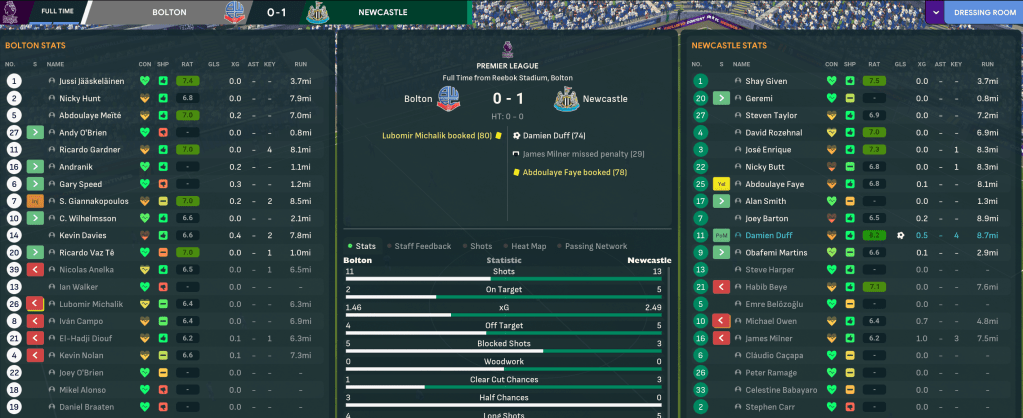 Ironically, Mahtal’s reign began at home to his predecessor as Big Sam brought Newcastle to the Reebok. Bolton created little, got stung by a shocking penalty decision that Jussi saved, then gifted a late winner to Damien Duff. A tricky start to the season continued with a 3-1 loss at Arsenal before they looked to be heading to an unlucky defeat at home to Man UFC. But Anelka stood up with a superb brace, only for Carlos Tevez to nick a 95th-minute equaliser, before Davies earned a 1-1 at Everton. Mahtal’s first win finally arrived as Davies scored both in a 2-0 success at home to Reading, before another challenging game as leaders Liverpool came to town. Christian Panucci scored their first shot and they looked to be earning an undeserved win, only for Anelka to save the day with the last kick. So after playing 5 of the suspected top 7, Bolton had done well to sit in 11th place.