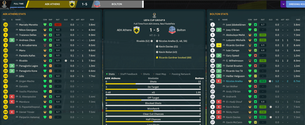 Mahtal’s first taste of European football saw Bolton given a UEFA Cup group alongside AEK, SK Rapid and PSV. They started at AEK and got a flyer as Wilhelmsson whipped in a low cross for Anelka to tap home then Gardner got forward to float the ball into Davies, who powered a header into the far corner. And it was all over by half time as Michalik collected the ball from a corner and teed up Nolan to curl home a tidy finish. Davies sent Anelka through to power home his second just after the break then complete his hat trick either side of a consolation by Rivaldo… THE Rivaldo!