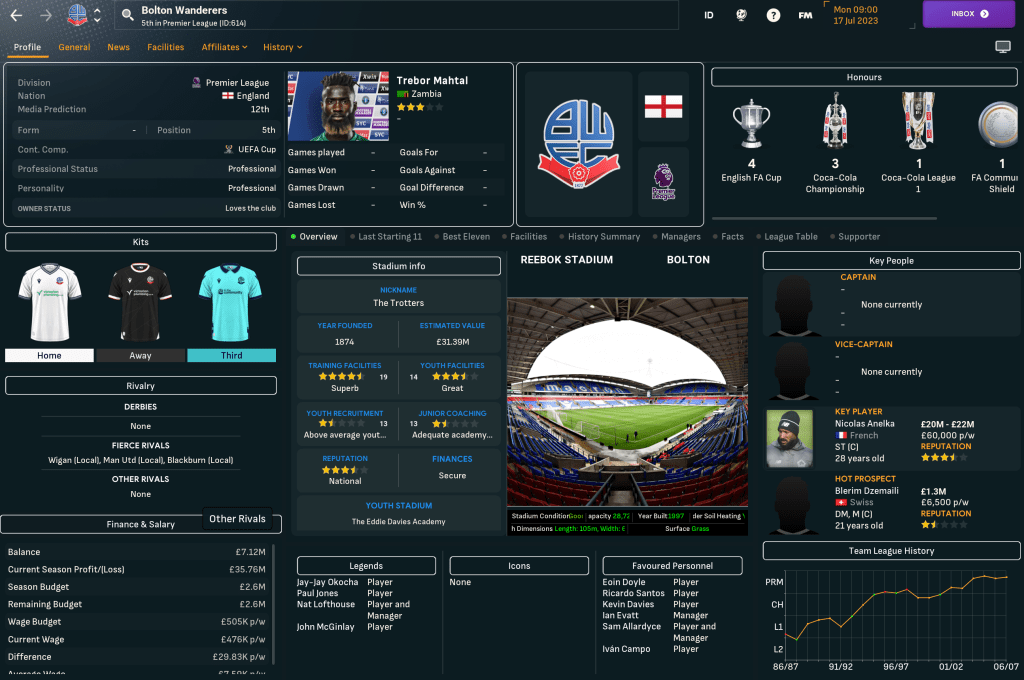 The club’s finances aren’t spectacular, with £7m in the bank, a transfer budget of £2.6m and £30k spare in a weekly wage budget of £505k. But the Eddie Davies Arena offers 19 training facilities, 14 youth facilities and 13 youth recruitment and junior coaching alongside the iconic Reebok Stadium.